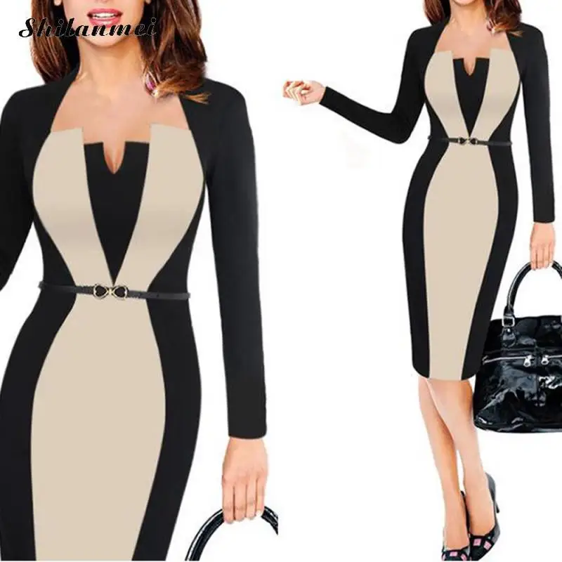 | 2018 Summer Women Retro Contrast Patchwork Belt Wear to Work Business vestidos Office Bodycon Pencil Female One Piece Dress Suit |