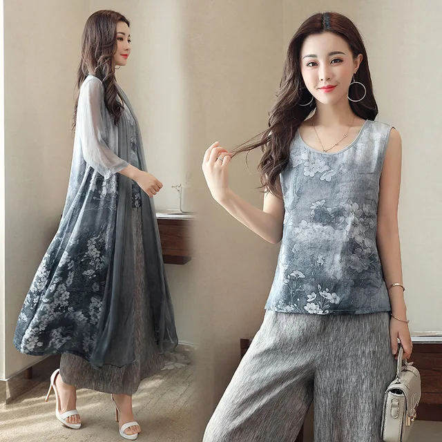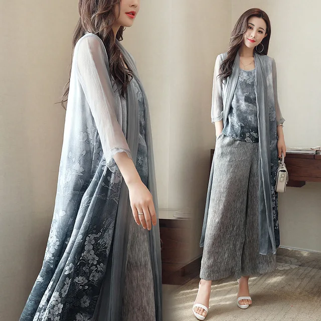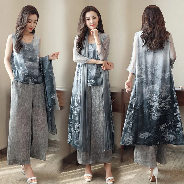 Mother Of Bride Wedding Vintage Printed 3 Piece Sets Women Plus Size Cardigan Jacket Wide Leg Pants Suits Spring Summer PantsuitBuy Now On Aliexpress