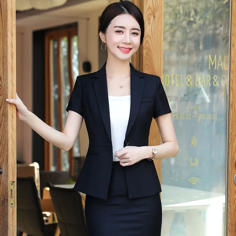 | Short Sleeve Formal Uniform Styles Blazers Suit 2 Pieces Tops and Skirt for Ladies Office Work Wear Business Blazer Sets Clothes |