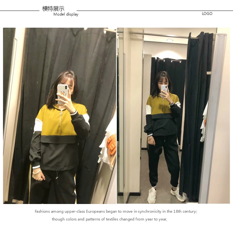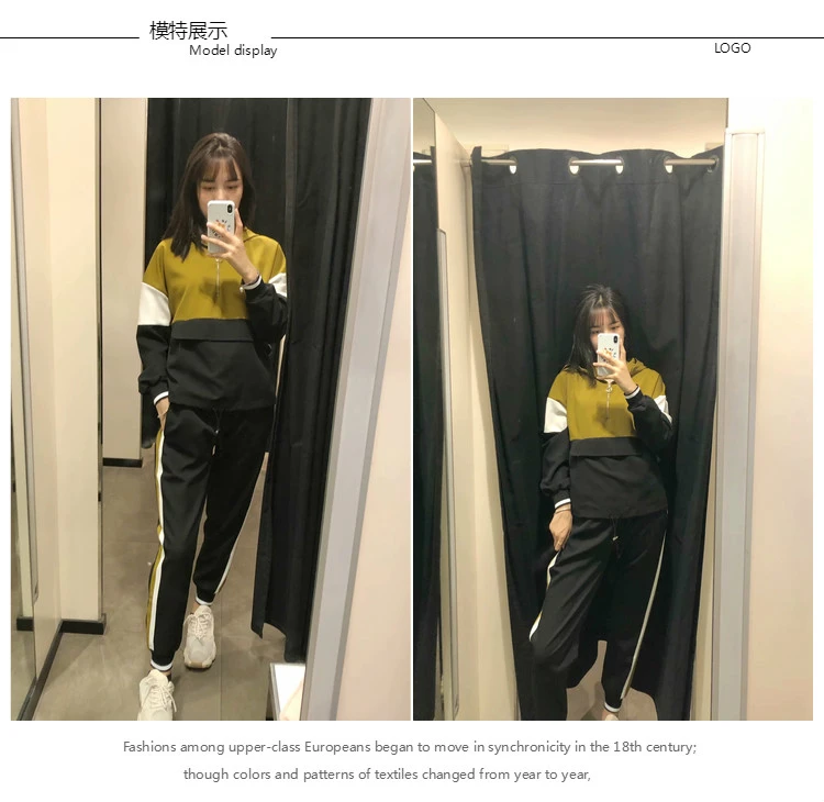 | Two-piece stitching jacket pants suit female patchwork kangaroo suit color hit color hooded jacket jogging pants suit jacket |