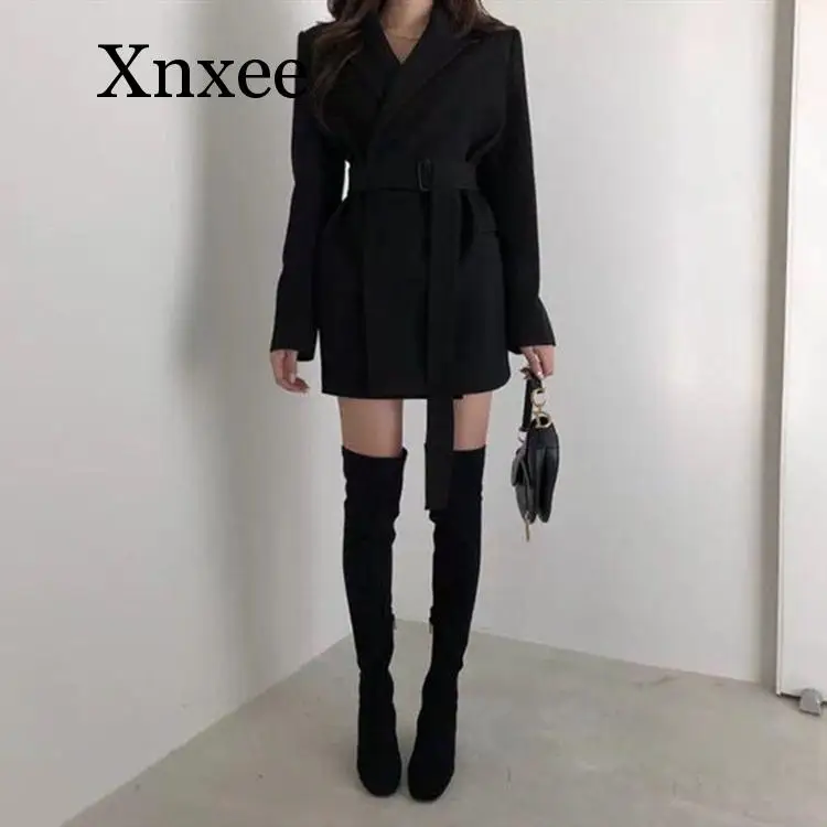 Winter Belt black blazer dress Women Elegant Double Breasted women blazers and jackets korean casual office long blazer full