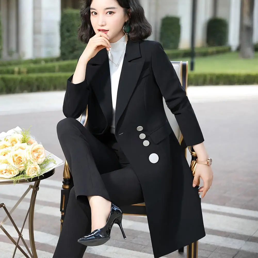 | Female Elegant Formal Office Work Wear OL High Quality Women Pant Suit Long Blazer And Pant Suit Green Red Black 2 Pieces Set |