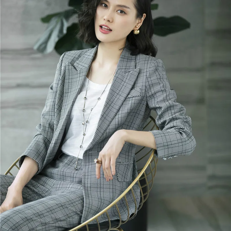 | High Quality Fabric Office Uniform Designs Women Blazers and Jackets Grey Plaid Ladies Business Elegant Formal Office OL Clothes |