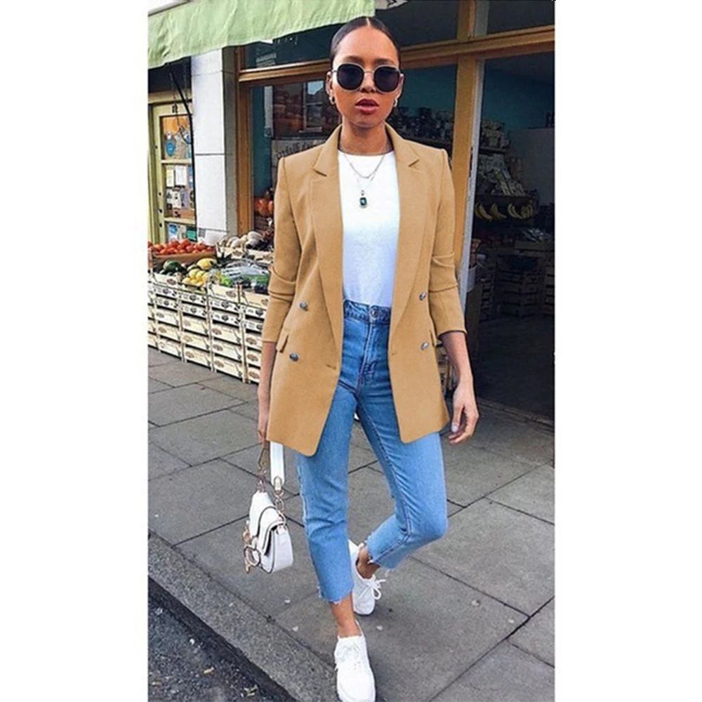 New Office Ladies Turn Down Collar Blazer Women Suit Jackets Long Solid Color Jacket Coats Casual Outerwear Blazer
