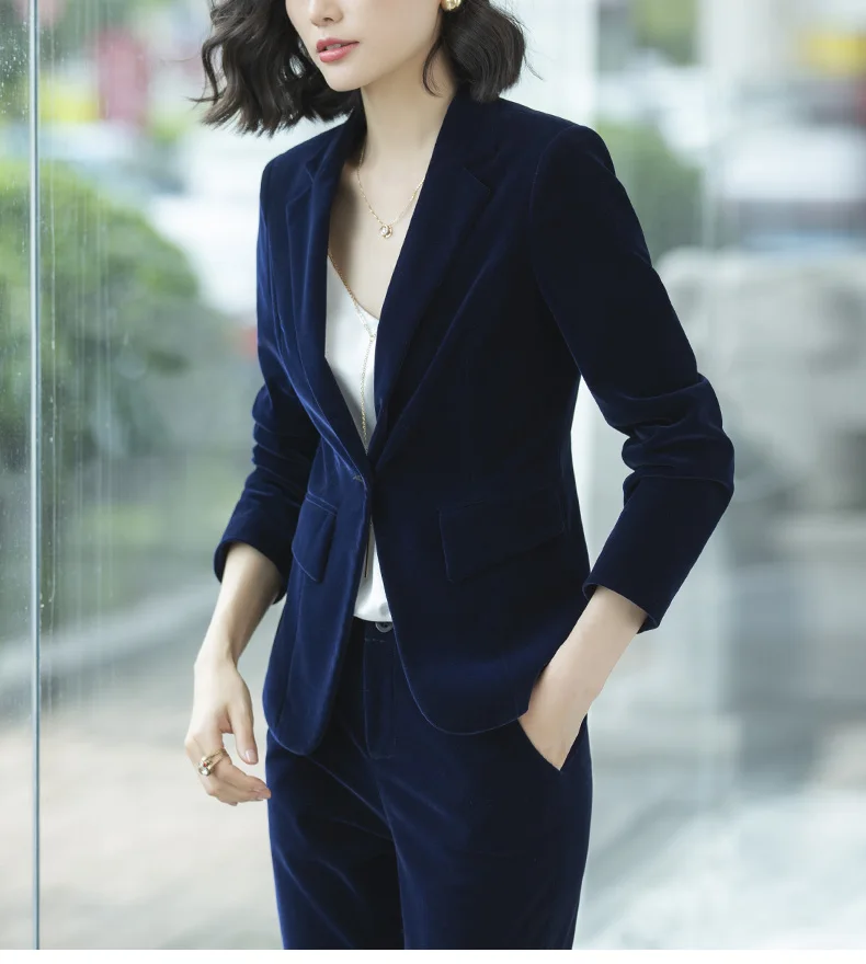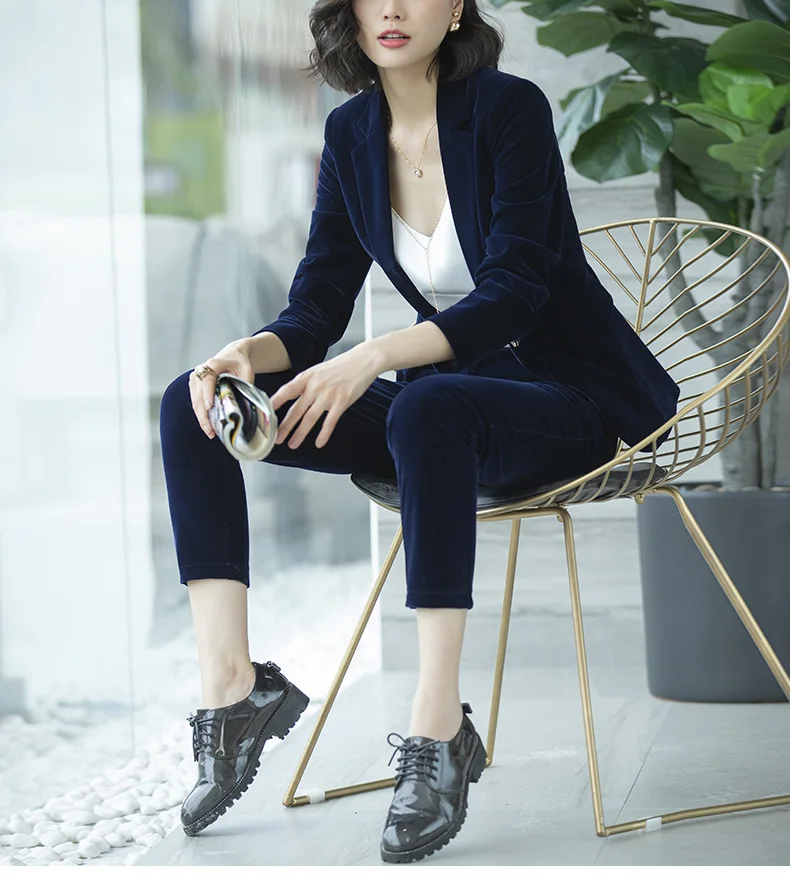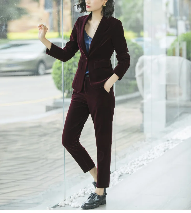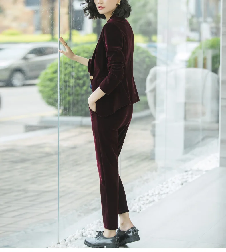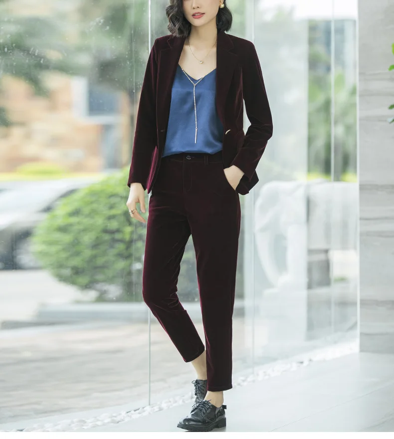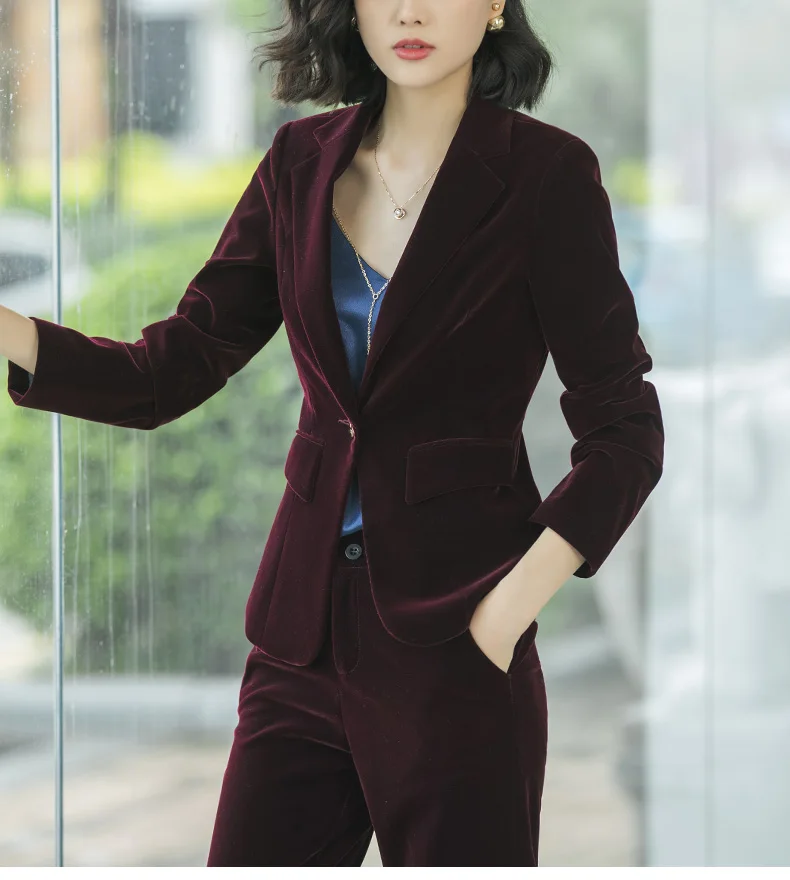 | Women's Gold velvet pants suits blazer soft warm fabric trouser jacket blue wine black blazer and pant office ladies work wear |