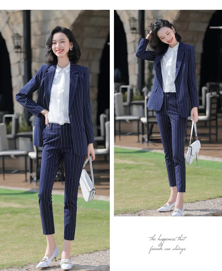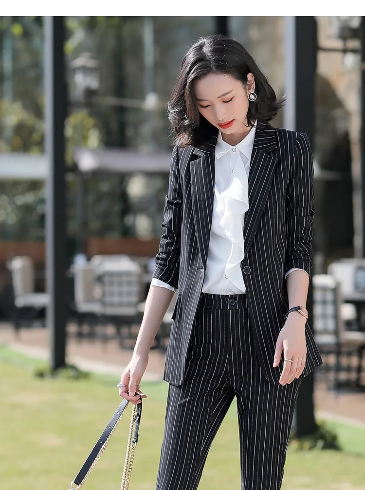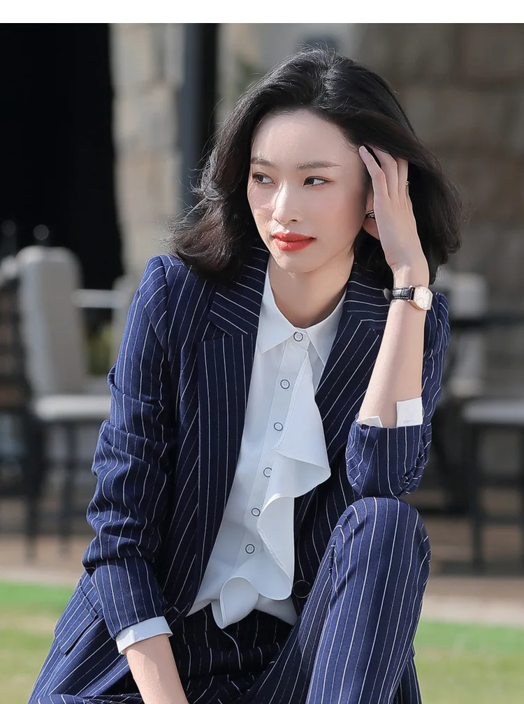 | Blue Stripe Office Work Formal Long Pant Suit Women's Business Lady OL Uniform 2 Piece Set Blazer Trouser Jacket Suits Plus Size |