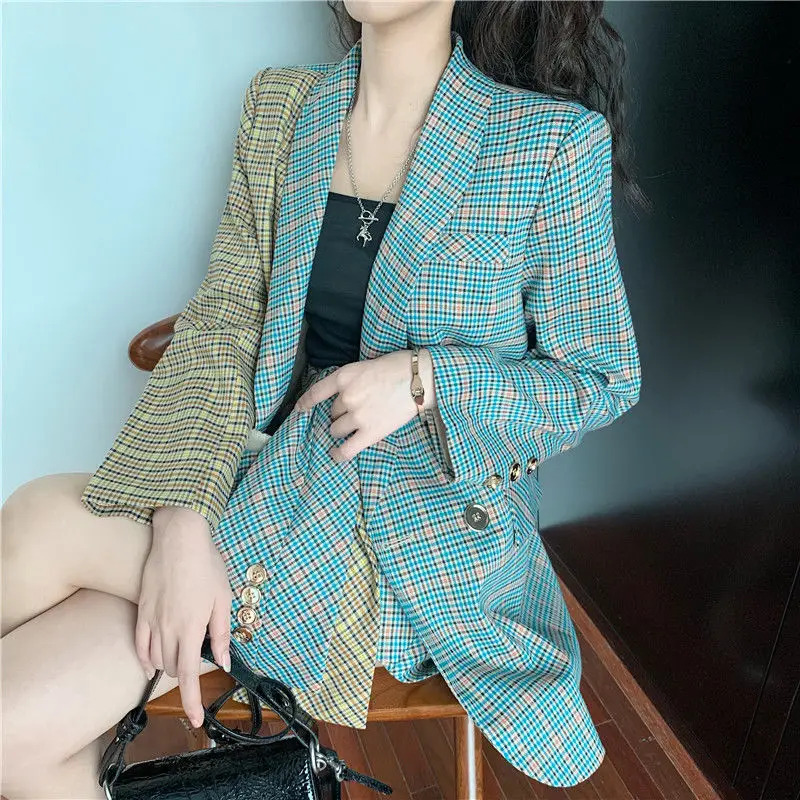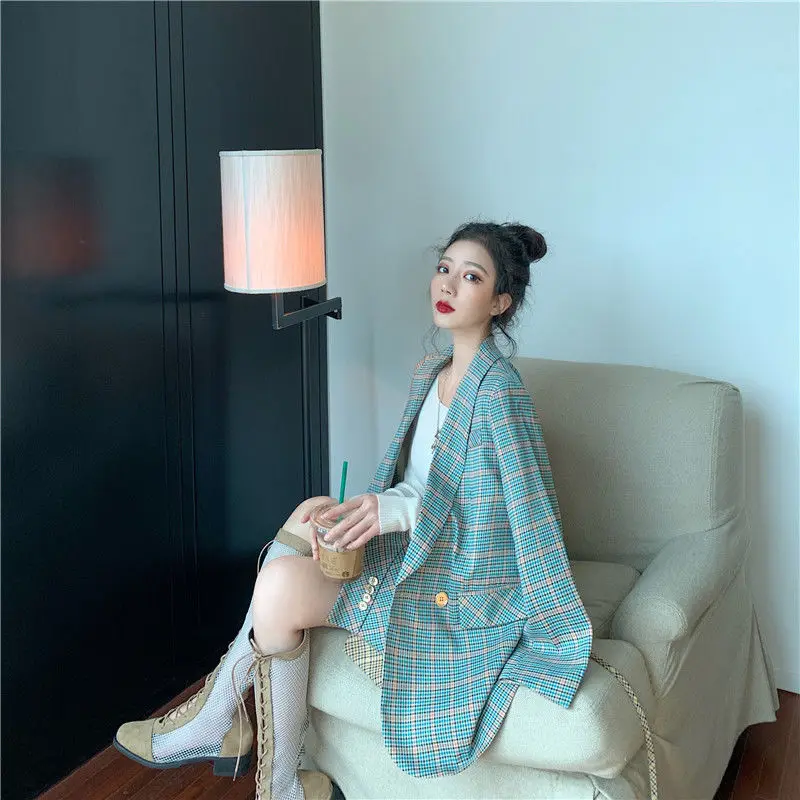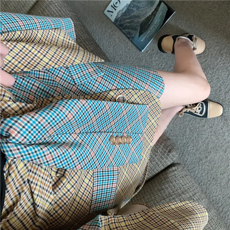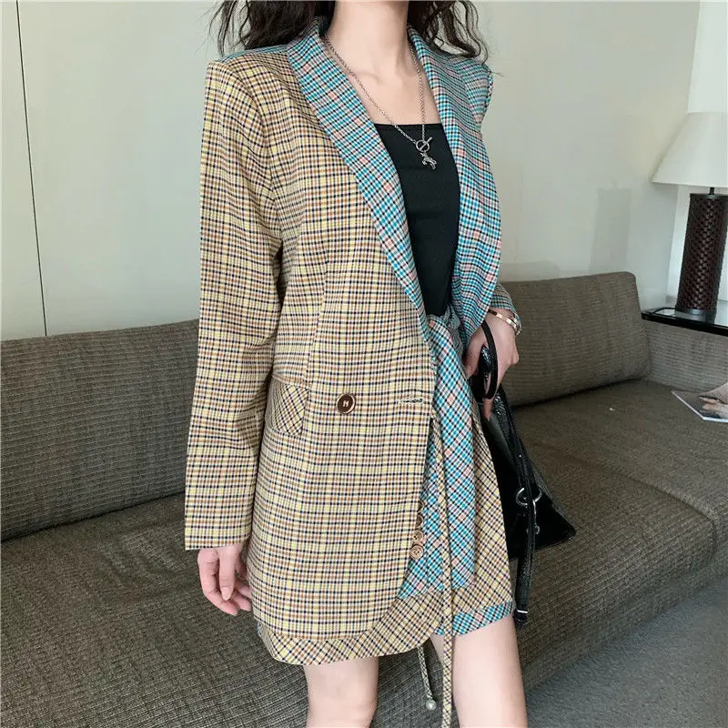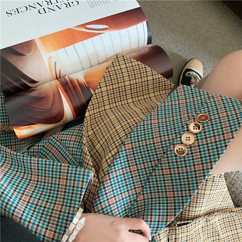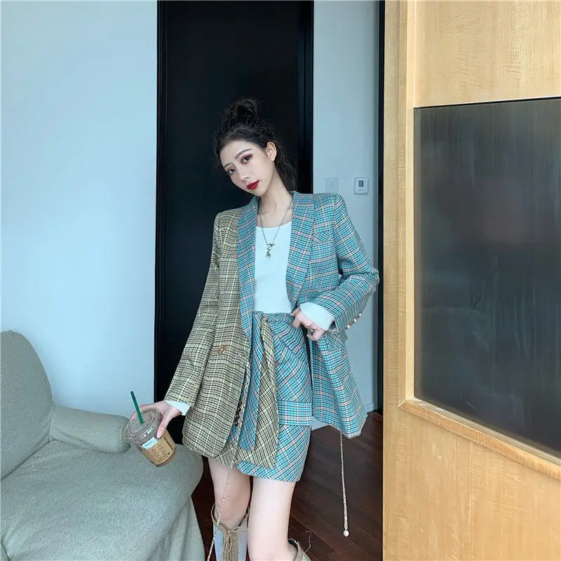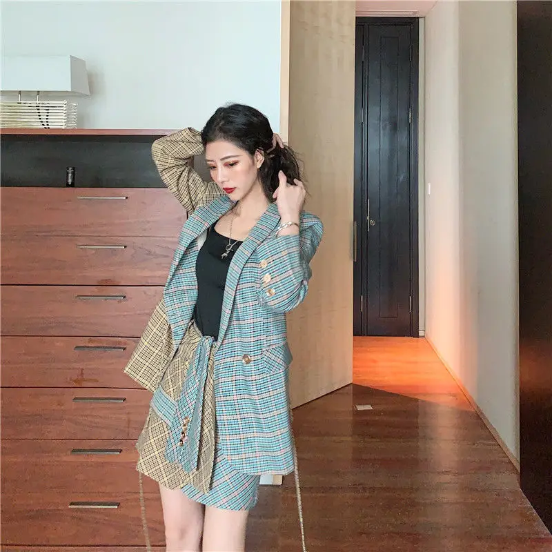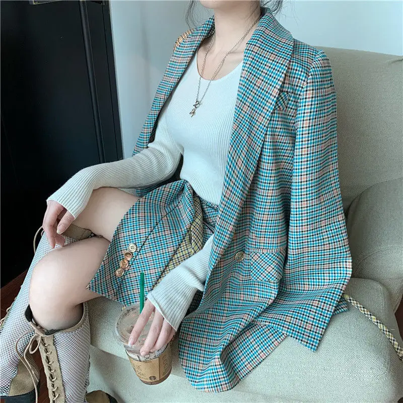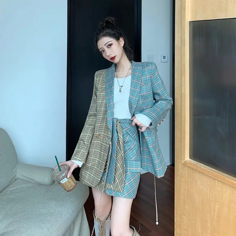 | Single breasted plaid two-pieces women skirt suit Casual streetwear female suit sets Fashion office ladies blazer suits New |