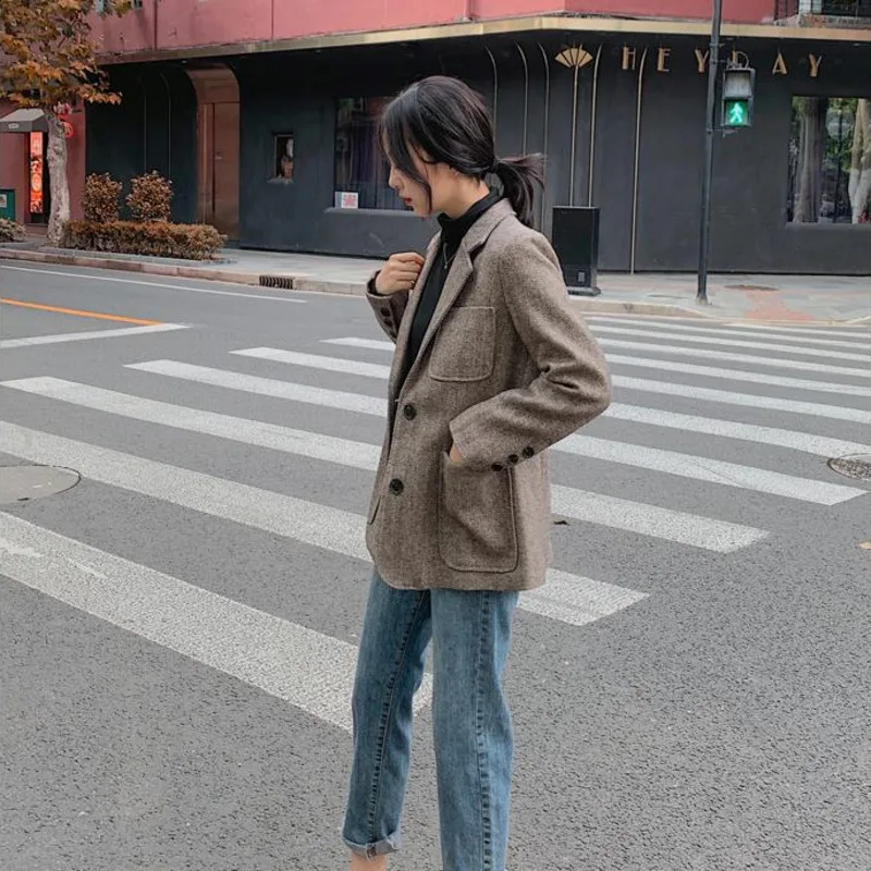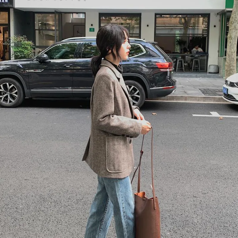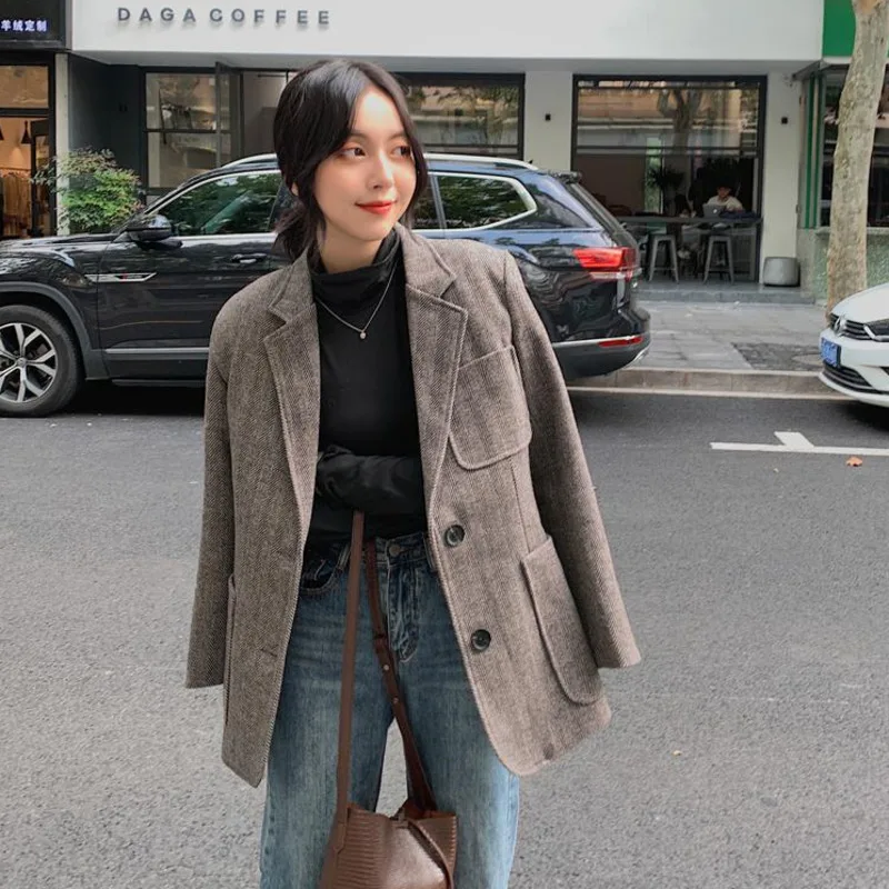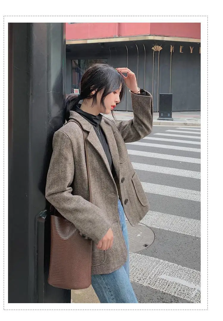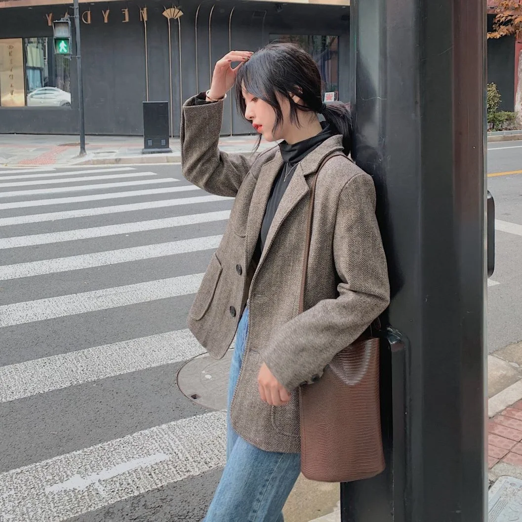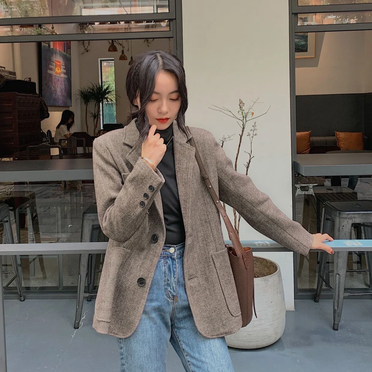 2019 Autumn Korean Blazer Women Herringbone Pattern Casual Blazers Single Breasted Office Lady Vintage Woolen Blazer Coats
