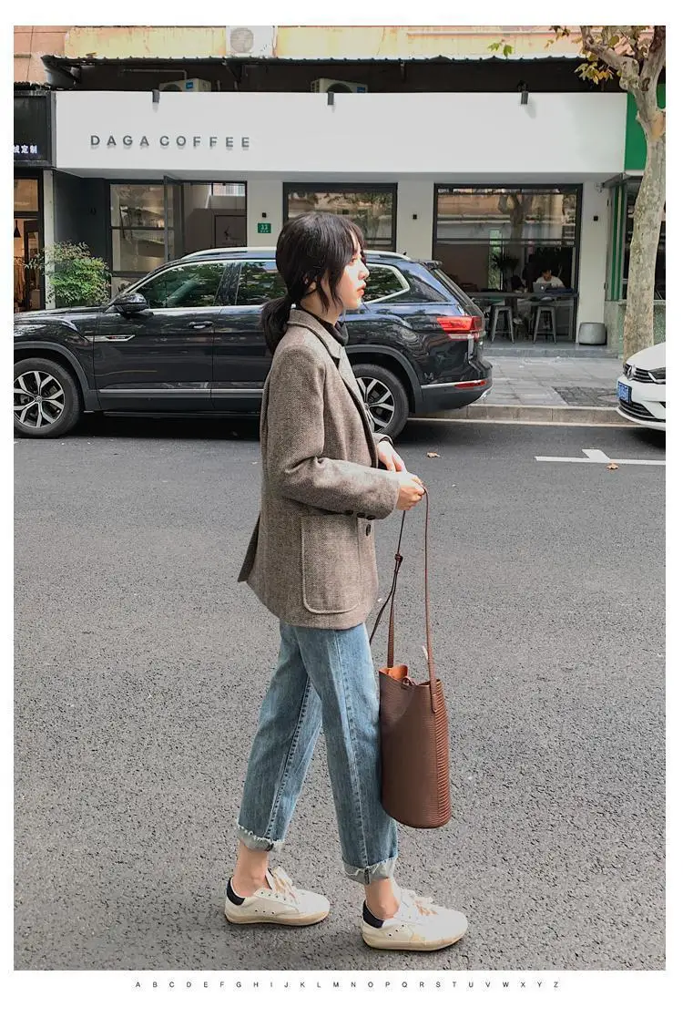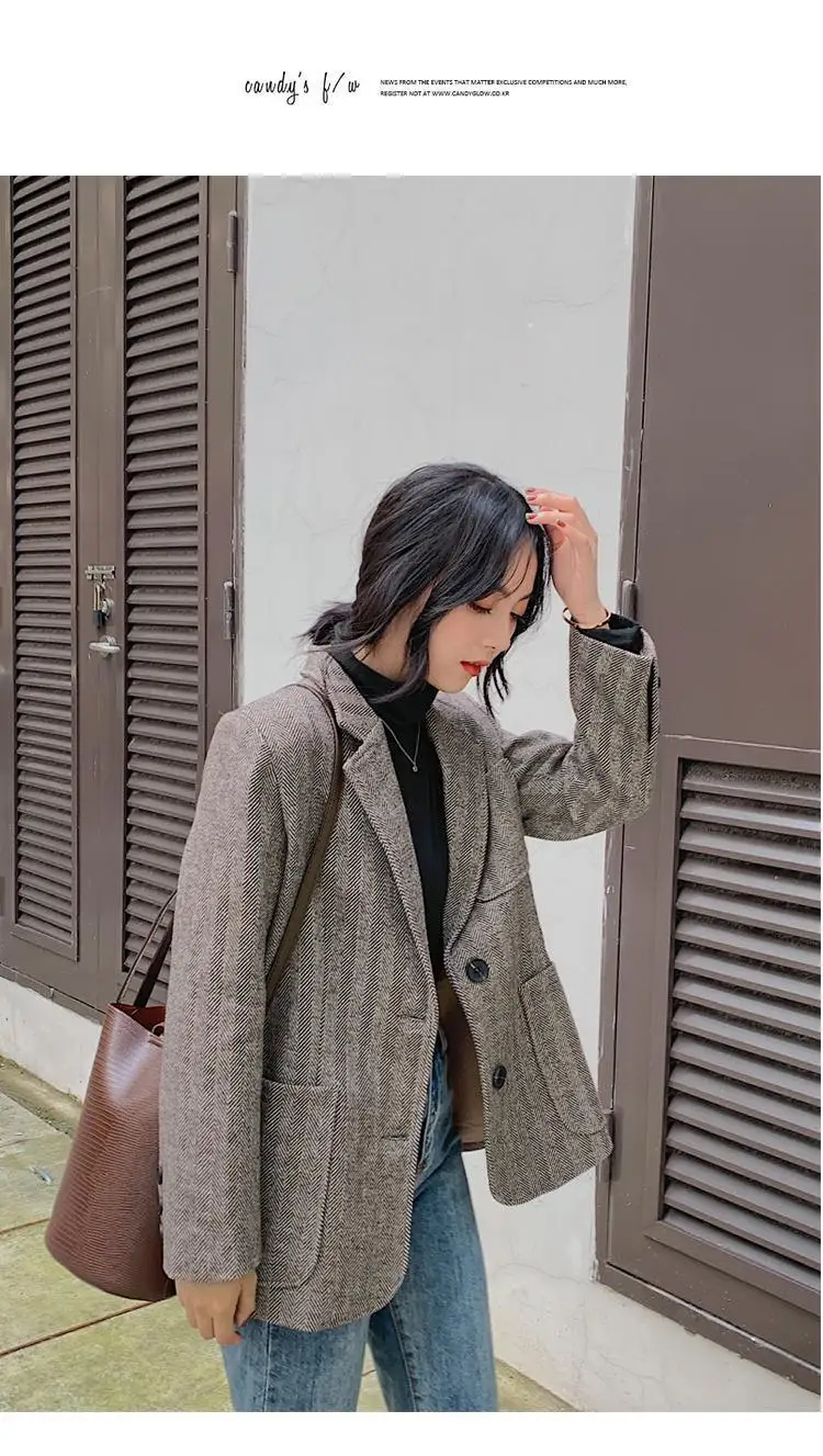 | Wool Suits Jacket Loose Blazer Coat Woman 2020 Spring Herringbone Stripe Single-breasted Casual Office Coat Ladies Winter Blazer |