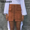 Danjeaner Autumn Winter Sexy Lace Up Leather Suede Skirts Women Vintage Cross Split Mini Skirt High Waist Bodycon Pencil Skirts USD 13.99-14.99