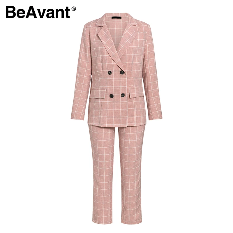 Simplee Fashion plaid women blazer suits Long sleeve double breasted blazer pants set Pink office ladies two-piece blazer sets