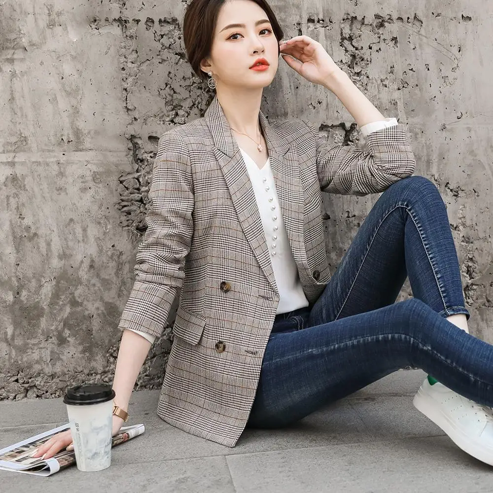 | Female Elegant Formal New Fashion Women Blazer Jacket Fall Winter Gray Apricot Plaid Girl Work Wear Long Sleeve Double Breasted |