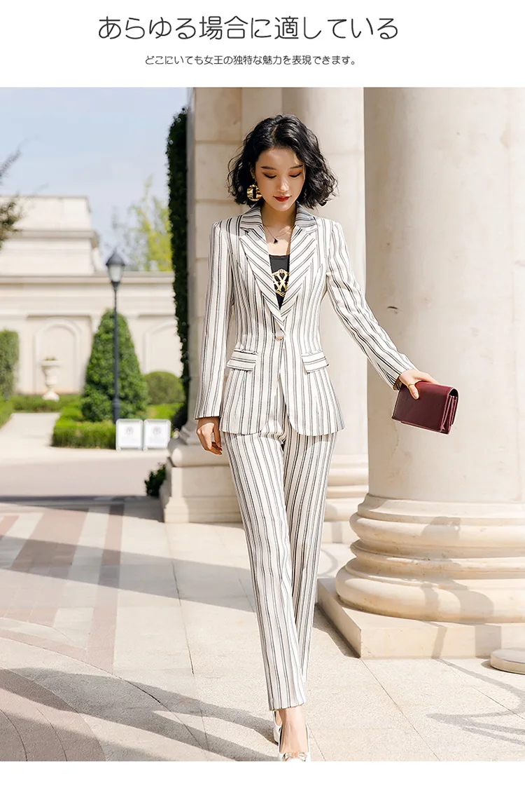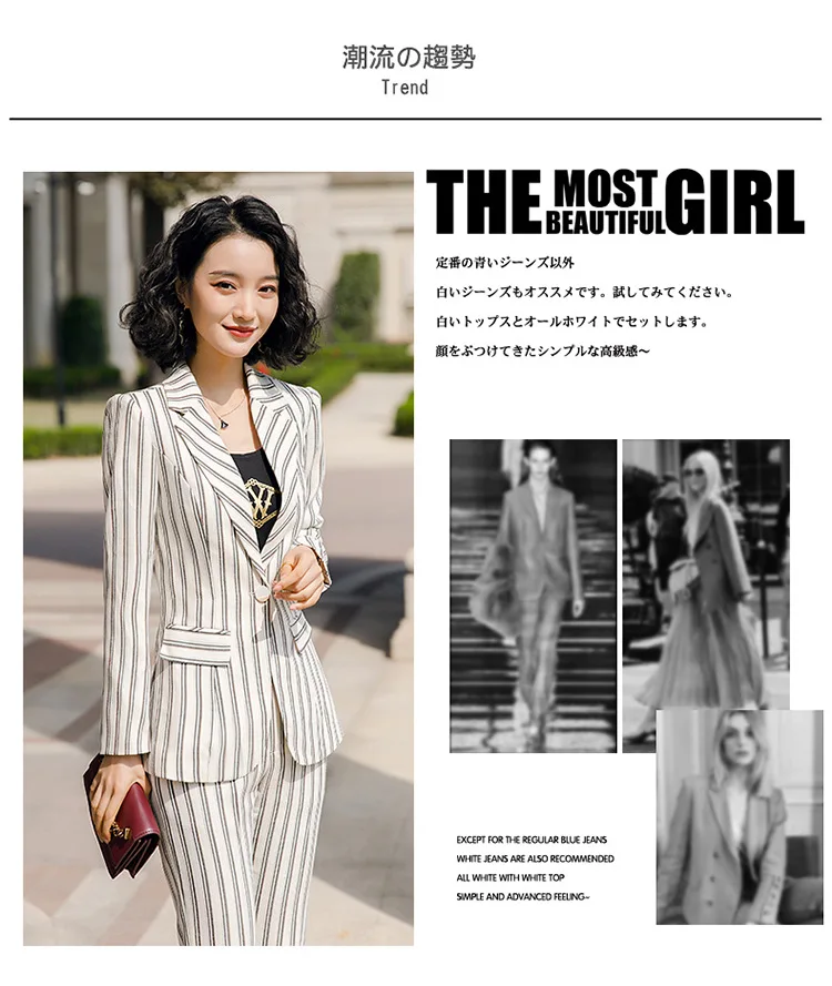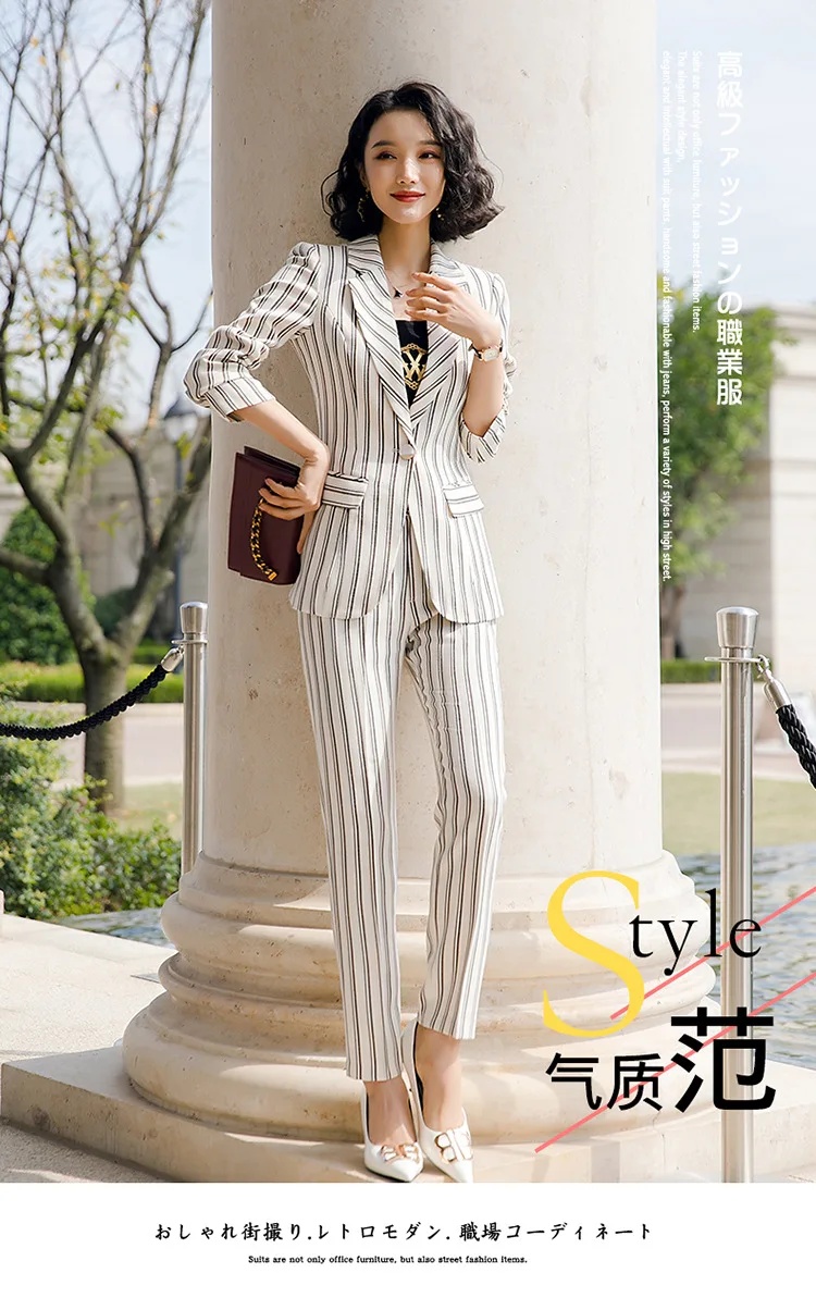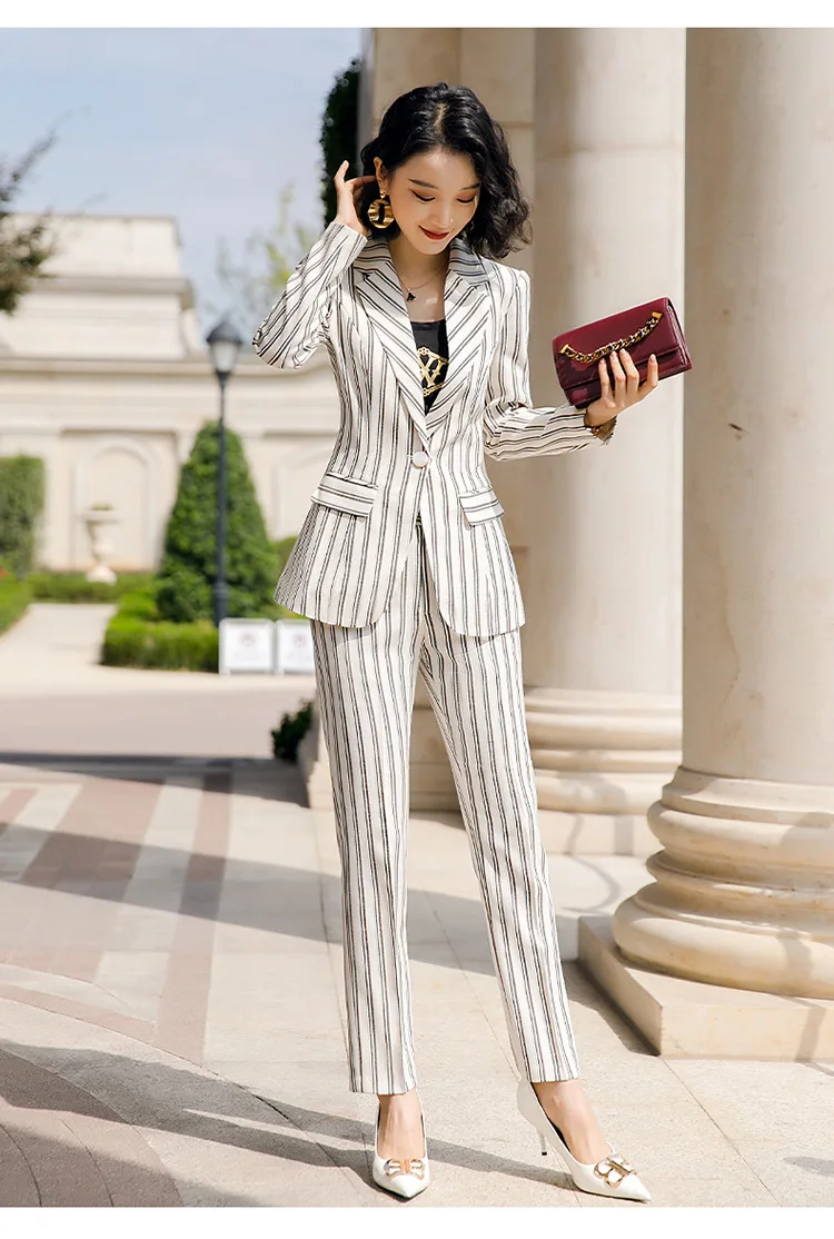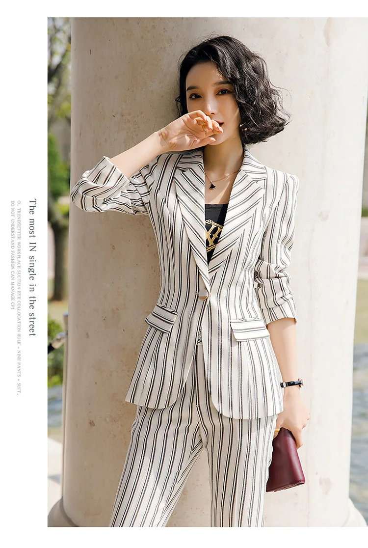 New 2020 White Female Elegant Stripes Women's Suit Set Blazer and Trouser Pant Business Uniform Clothing Office Lady Two PiecesBuy Now On Aliexpress