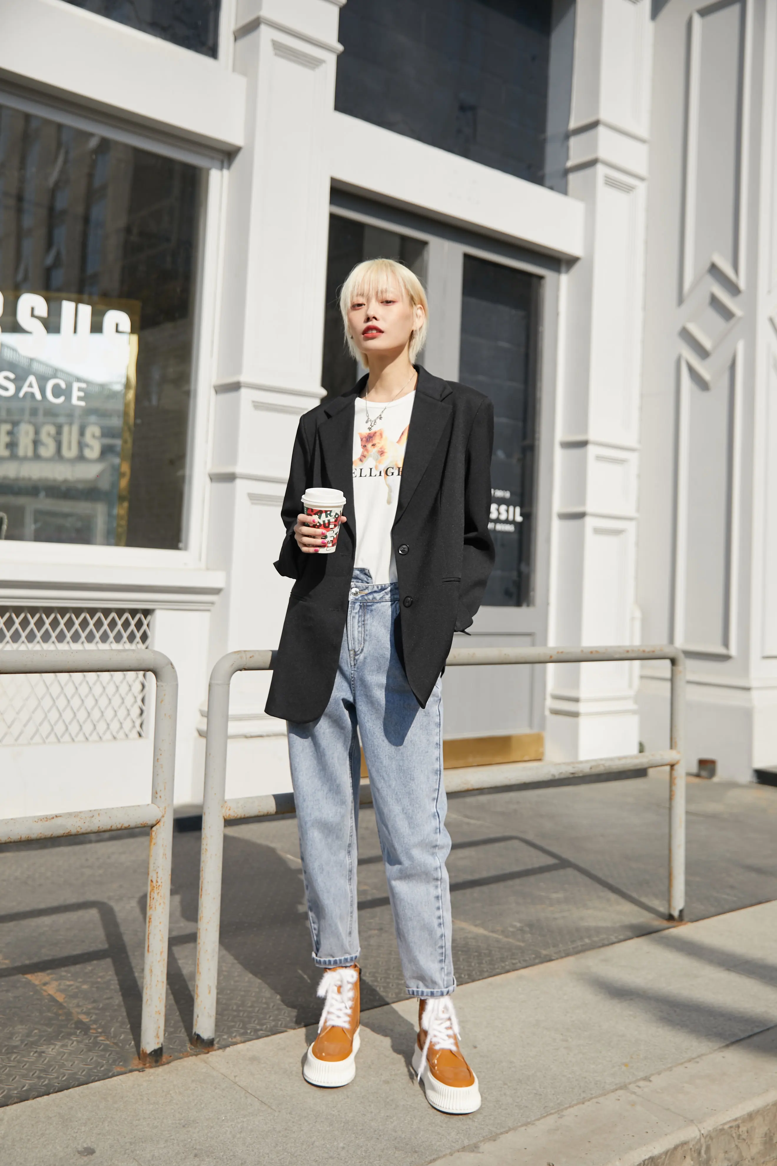 SAM'S TREE White Solid Double Button Korean Style Women Blazers 2020 Spring Graphic Print Sleeve Loose Casual Ladies Daily coats