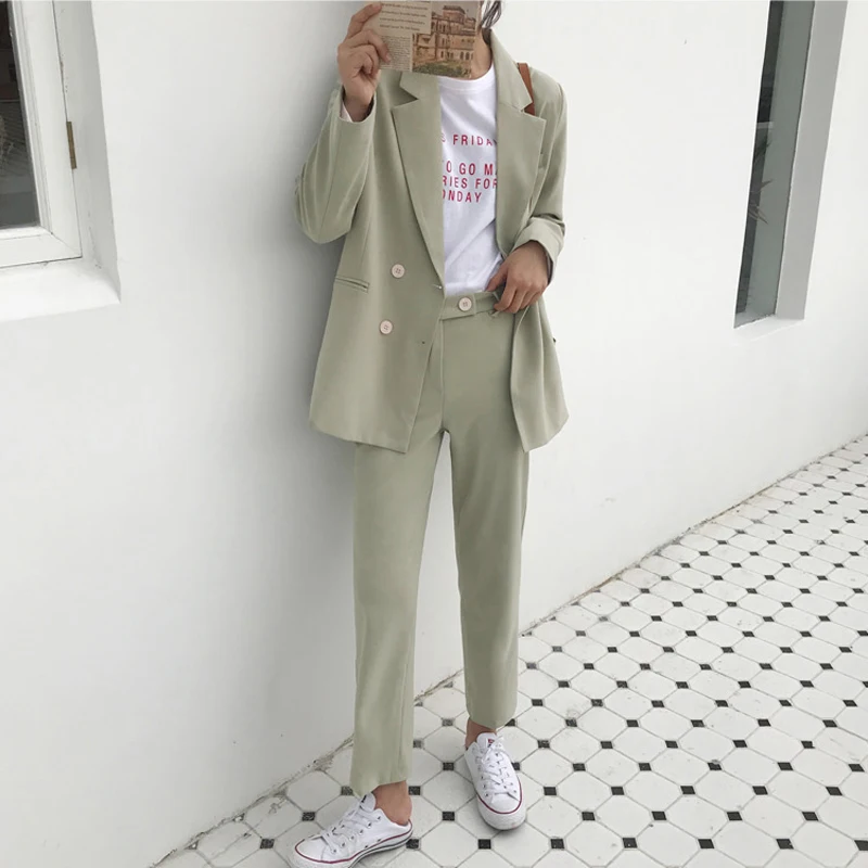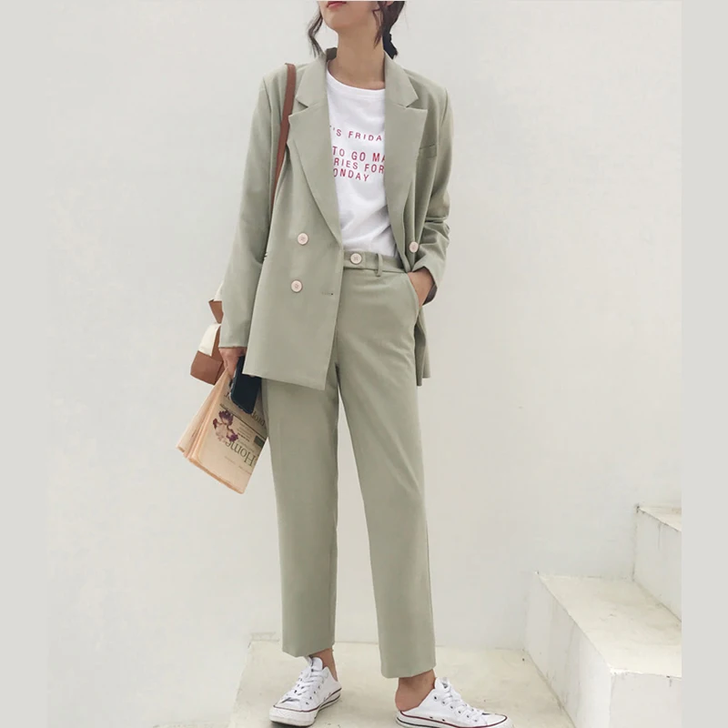 BGTEEVER Vintage Light Green Women Suits Double Breasted Female Pant Suits Blazer Jacket & Pencil Pant Casual 2 Pieces set femmeBuy Now On Aliexpress