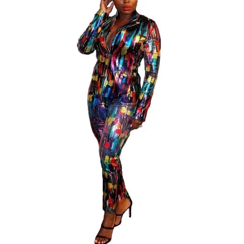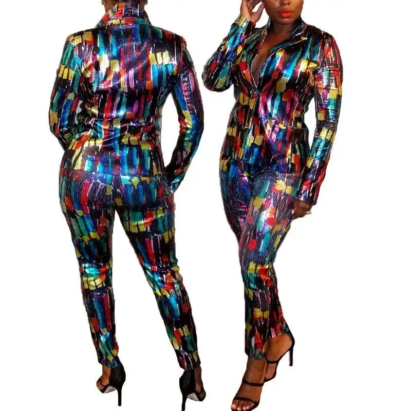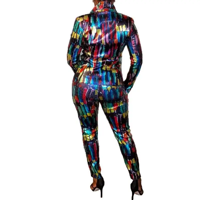 | 2020 Women Tracksuit Full Sleeve Sequined Print Blazers Pants Suit Office Lady Casual Elastic Waist Pants Two Piece Set |