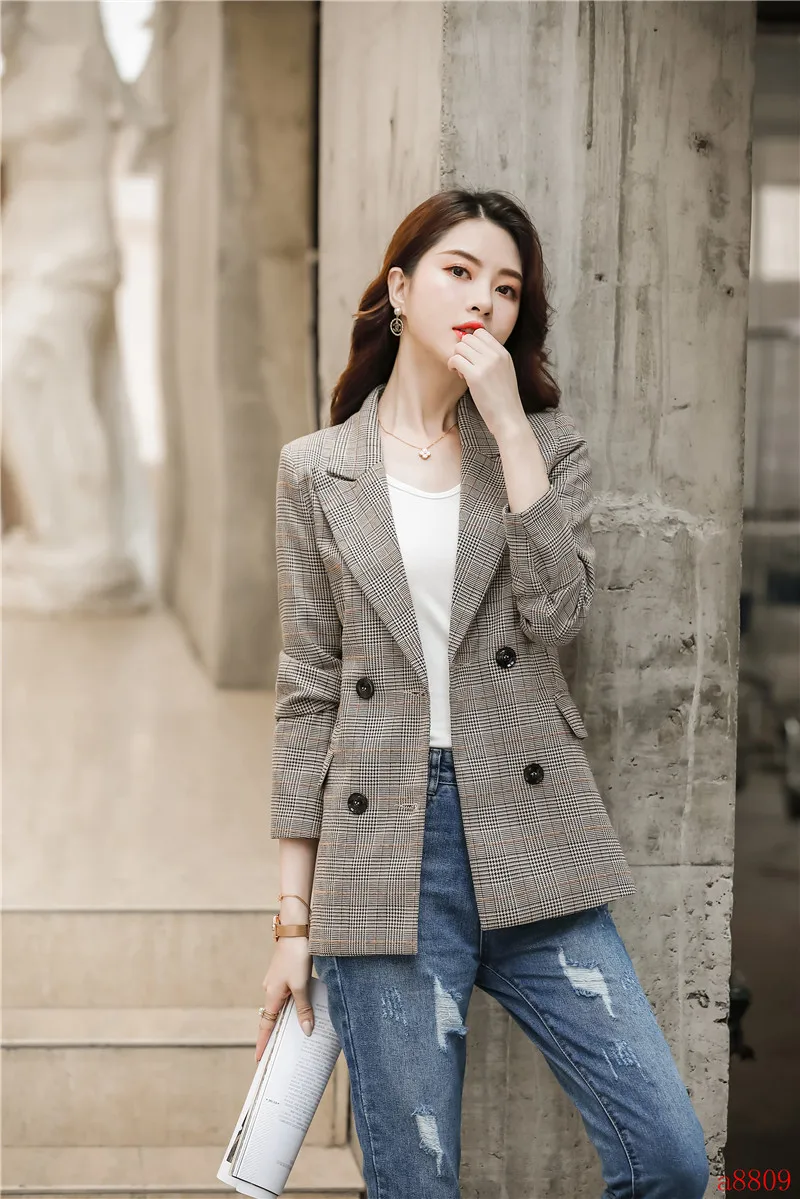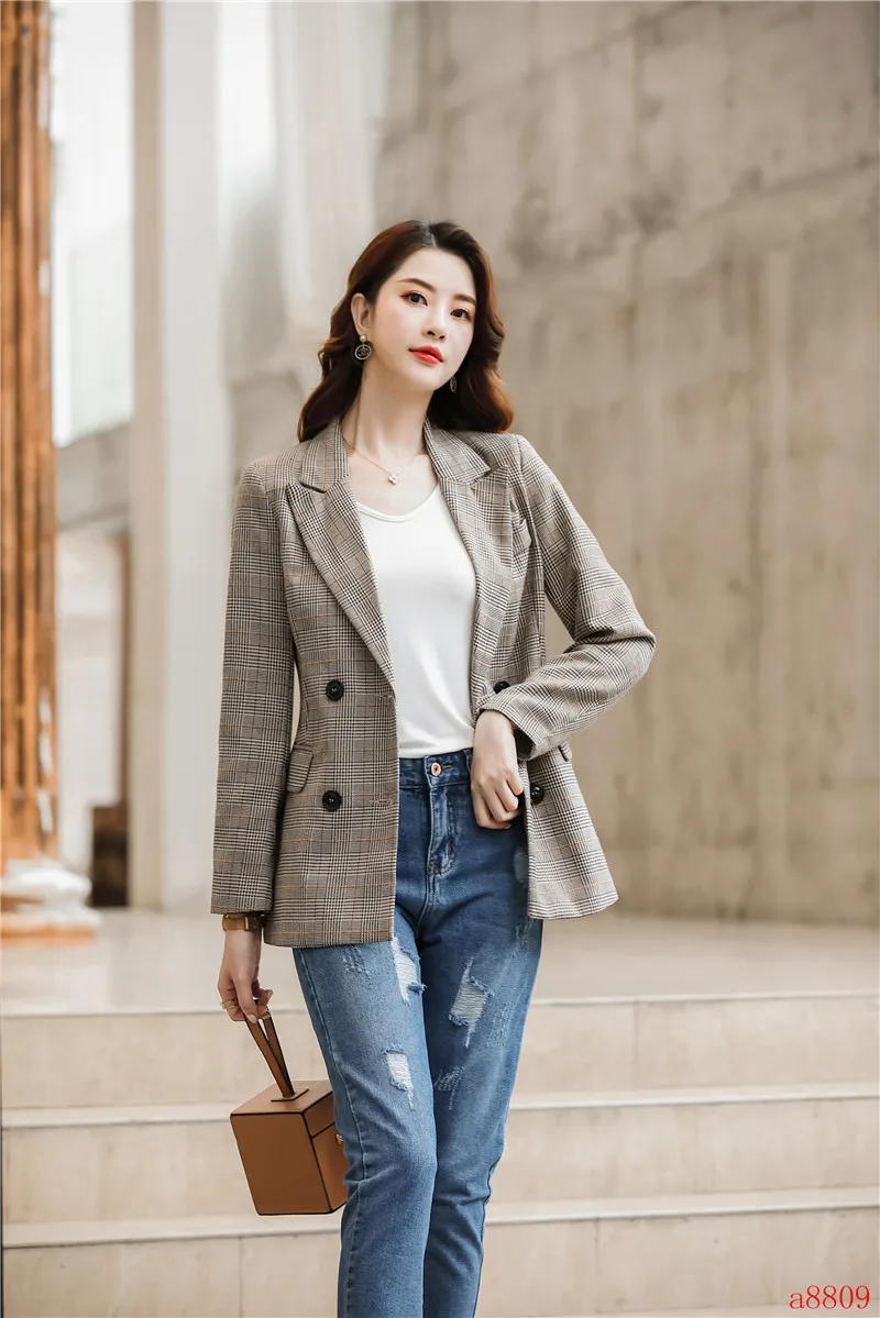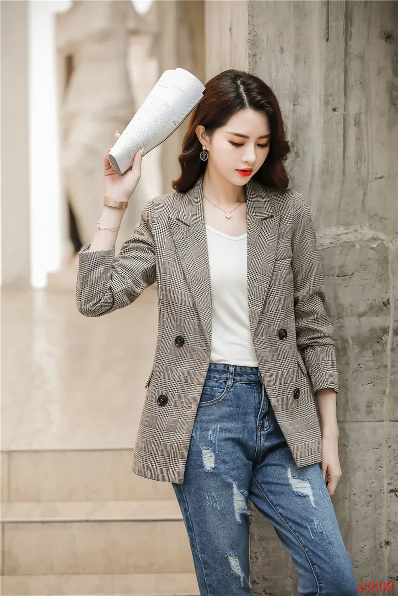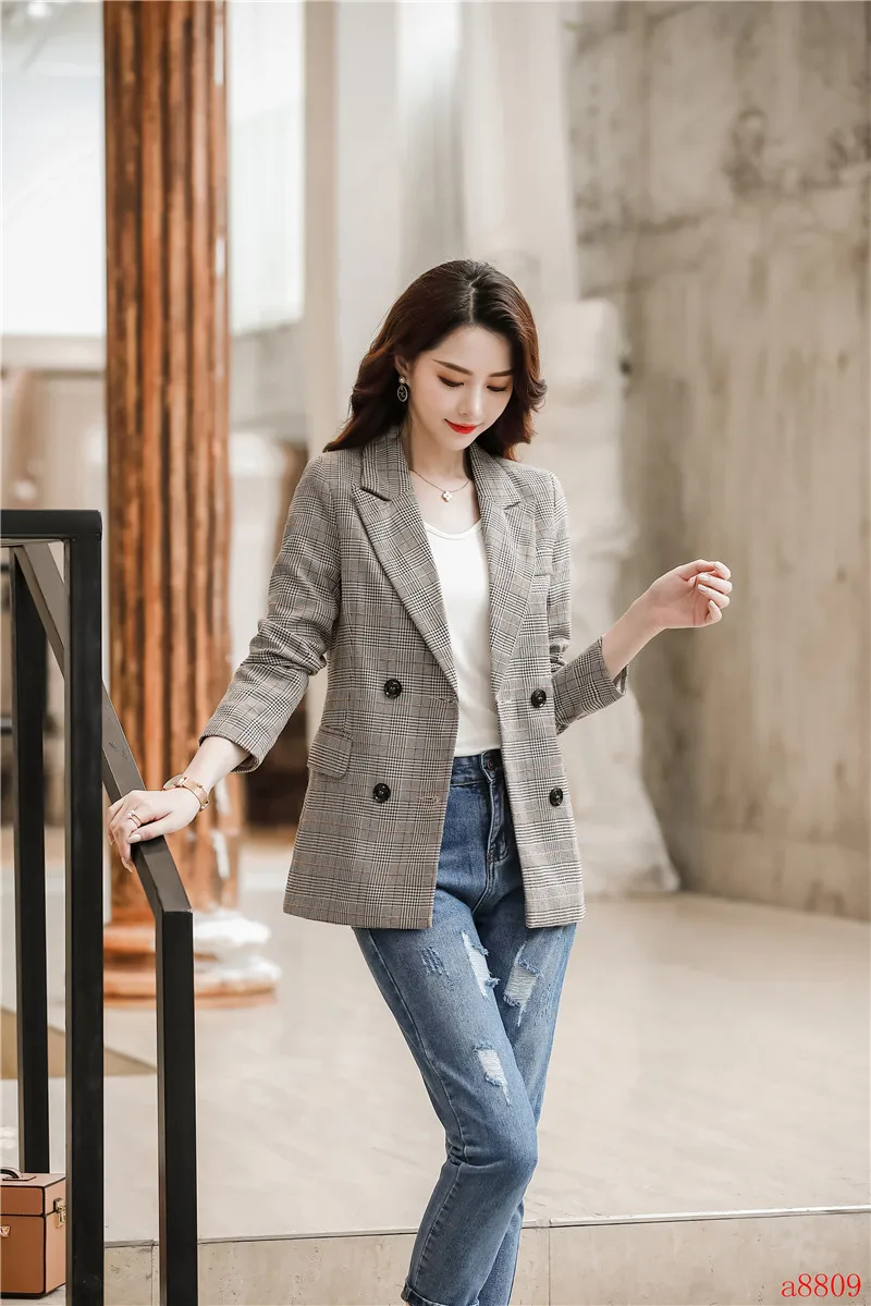 | Female Elegant Formal OL Spring Autumn Khaki Plaid Blazer Women Outerwear Coat & Jackets Office Ladies Clothes Double Breasted |
