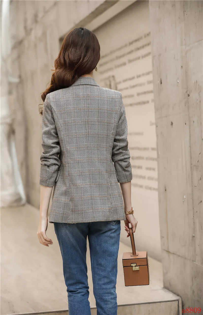 Women Slim Elegant Plaid Blazer Jackets Gray Brown Khaki Beige Girl Casual Tops New Fall Winter One Button Jacket Coat Plus Size