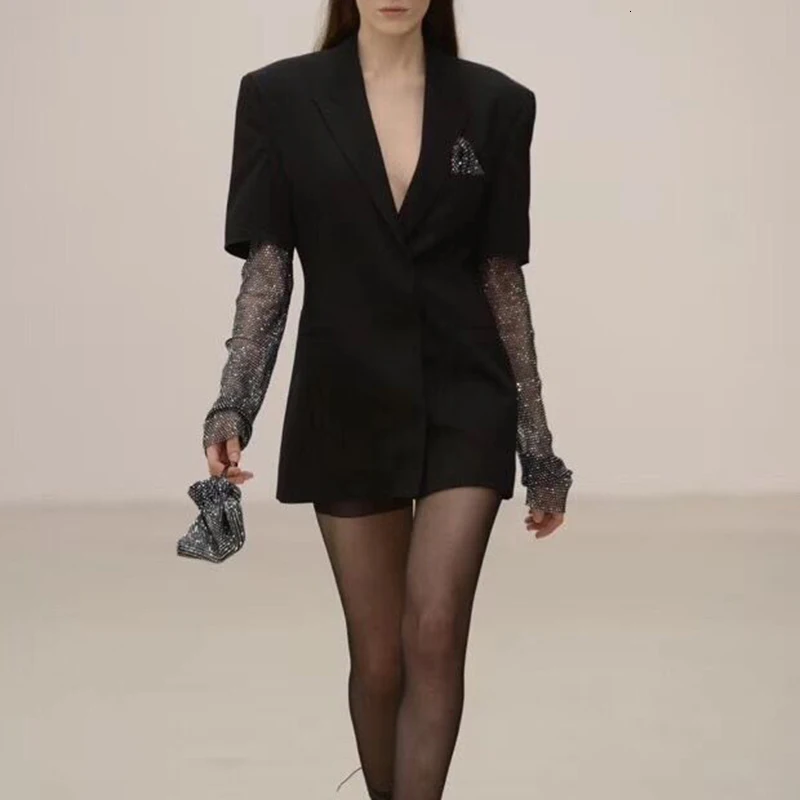 Bling Diamond Sleeve Blazer Jacket Woman Notched Collar Black Solid Pocket Runway Designer Long Blazer Coat Woman 2019 AutumnBuy Now On Aliexpress