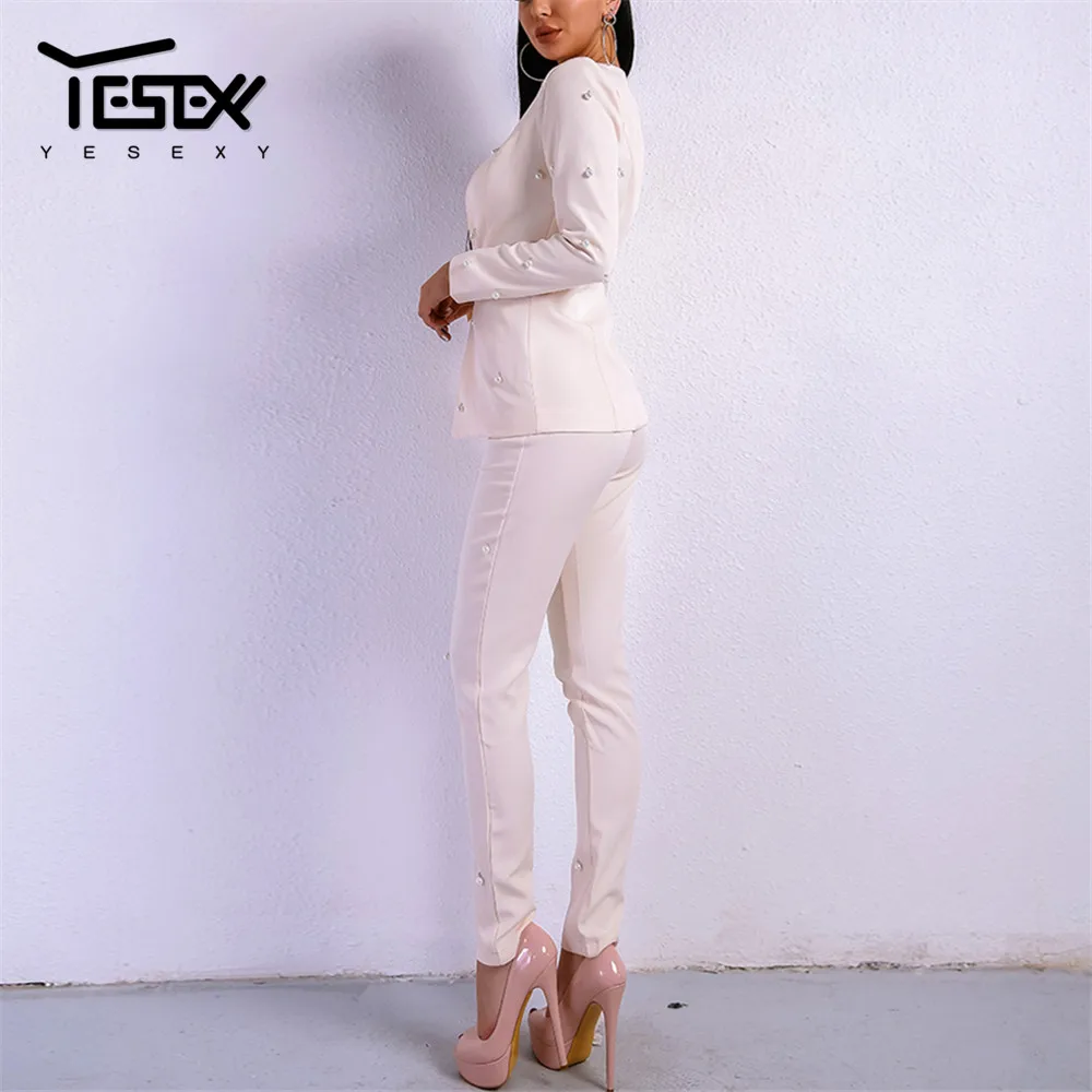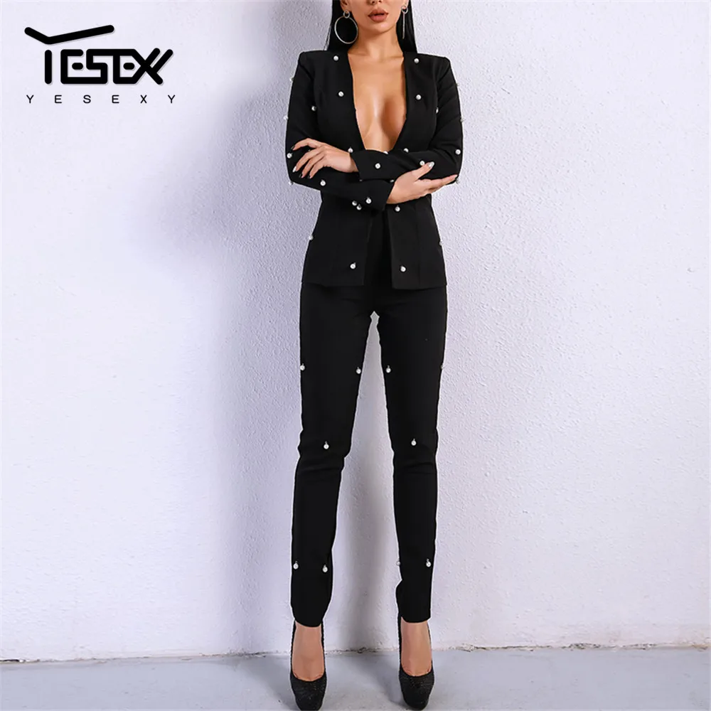 Best Price Comparison With Yesexy 2020 Sexy Long Sleeve Deep V Neck Women Blazer Suit Set Two Pcs Autumn Winter Solid Color Elegant WomenSuit VR8720