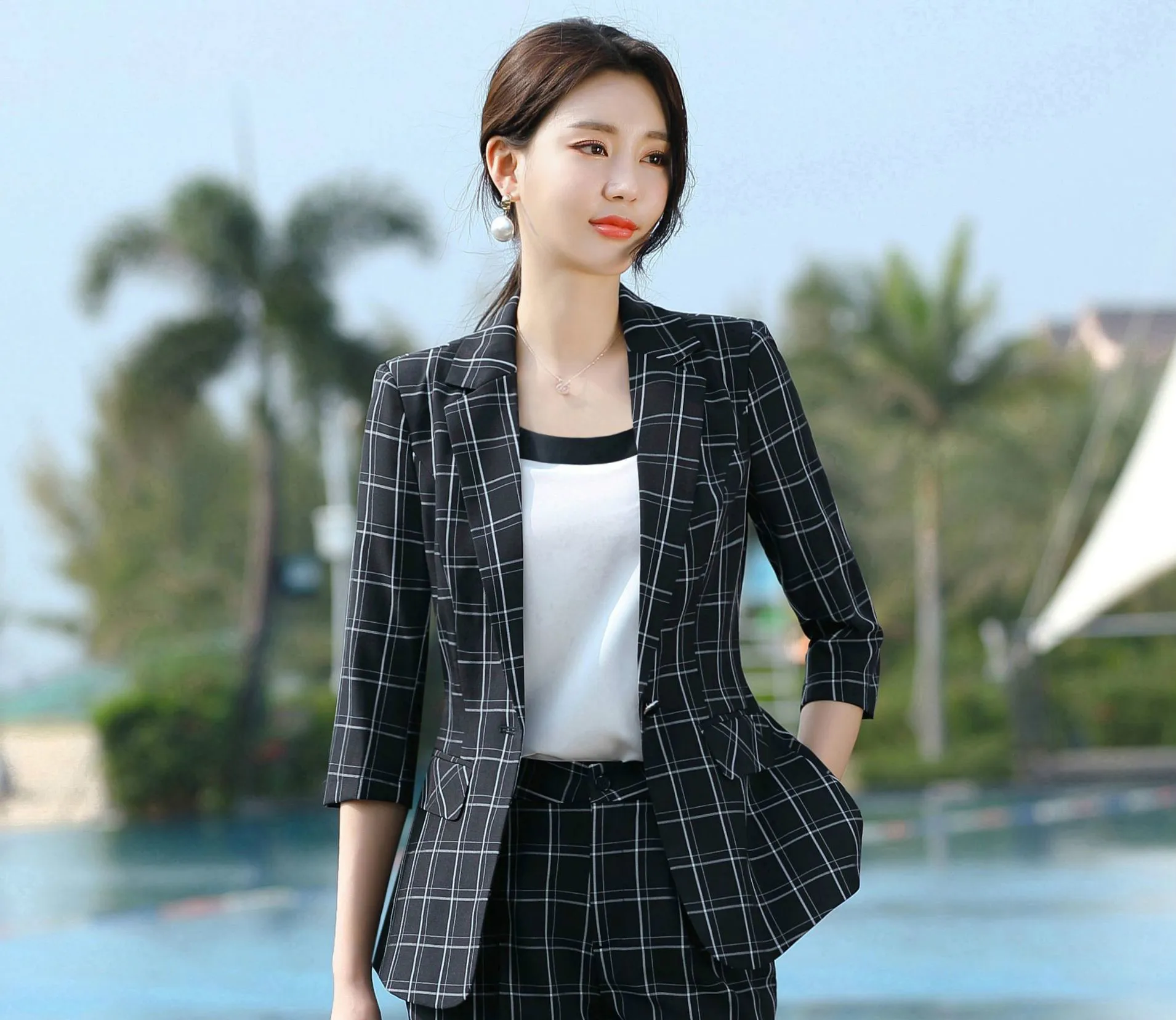 New 2020 Female Formal Elegant Plaid Women Office Lady Pant Suits of Business OL Blazer Suit Jackets Long Trouser Two Pieces Set