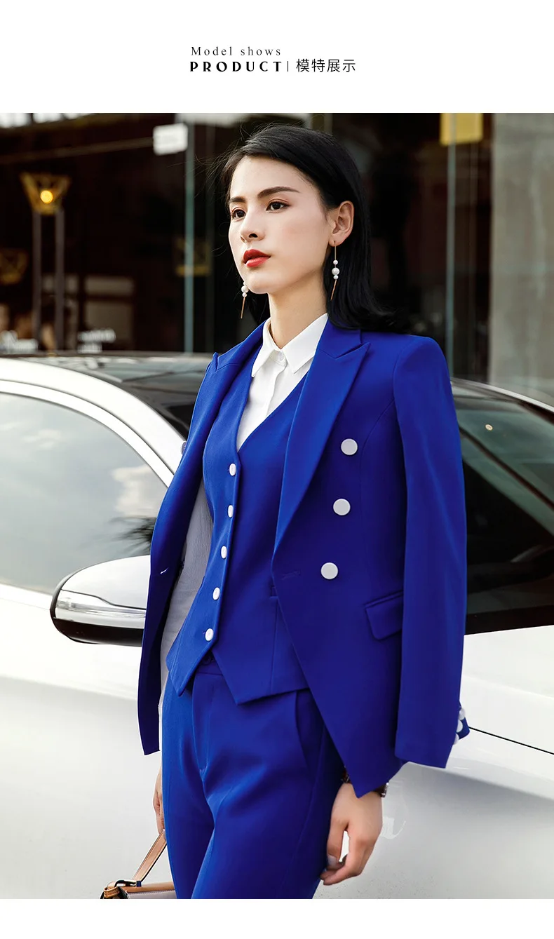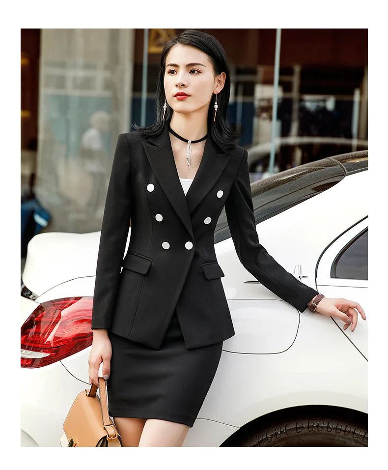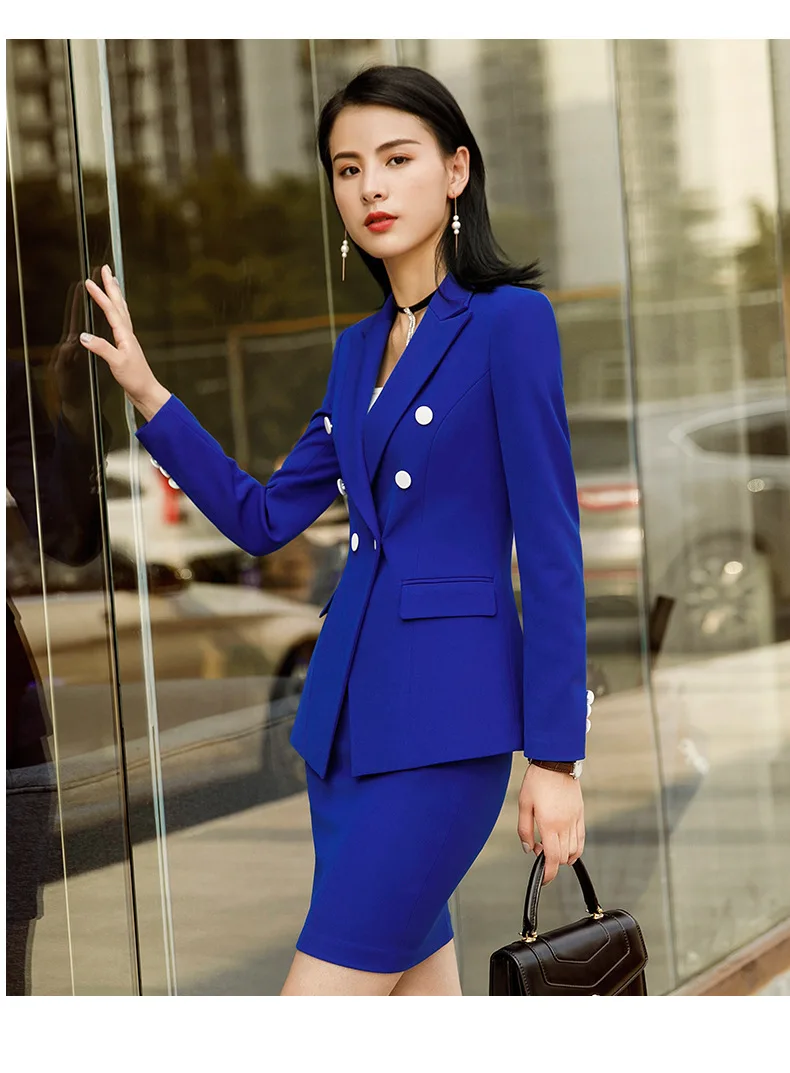 | Blue Formal Elegant Uniform Styles Blazers Suits Two Piece With Tops and Skirt For Ladies Office Work Wear Jacket Blazer Sets |
