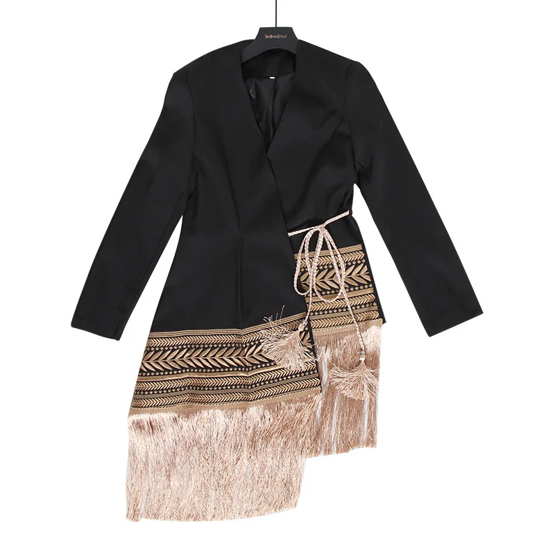 | Loose Fit Spliced Contrast Color Tassel Belt Jacket New V-neck Long Sleeve Women Coat Fashion Autumn Winter 2019 |
