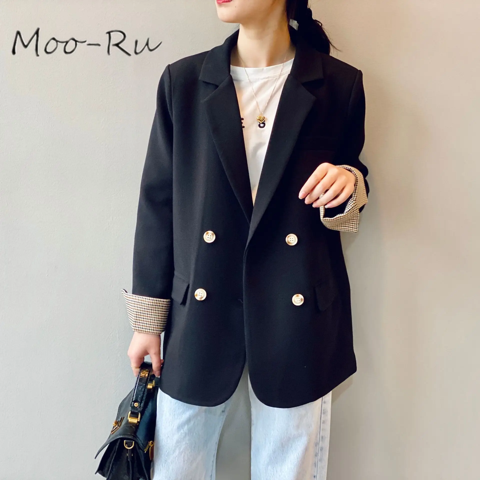 | Moo-Ru 2020Spring New Korean Web Celebrity Color Contrast Plaid Sleeve Double-breasted Blazer for Women |