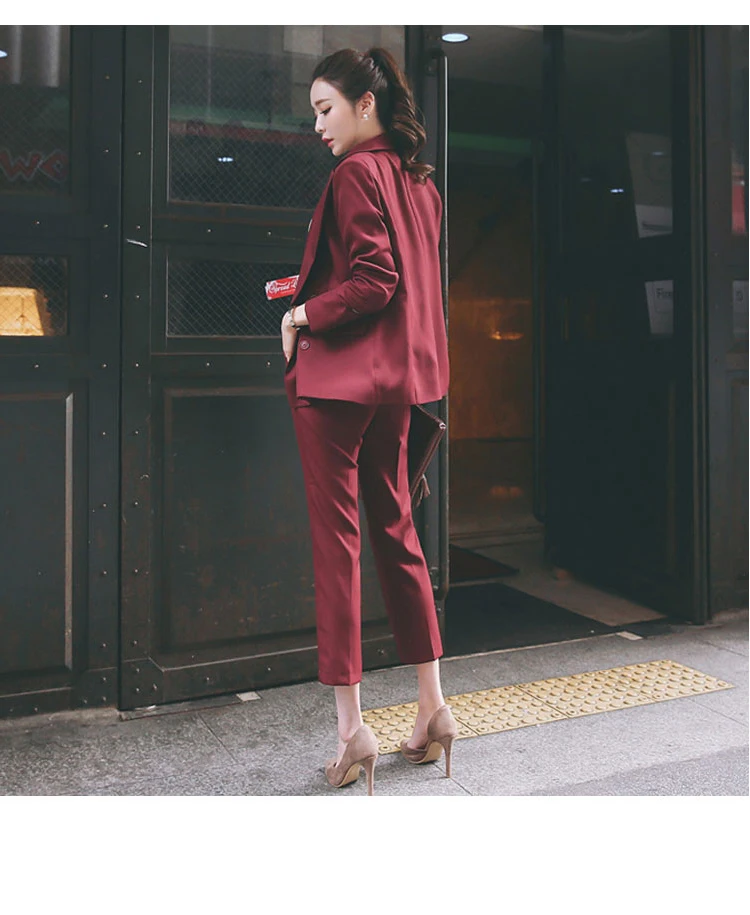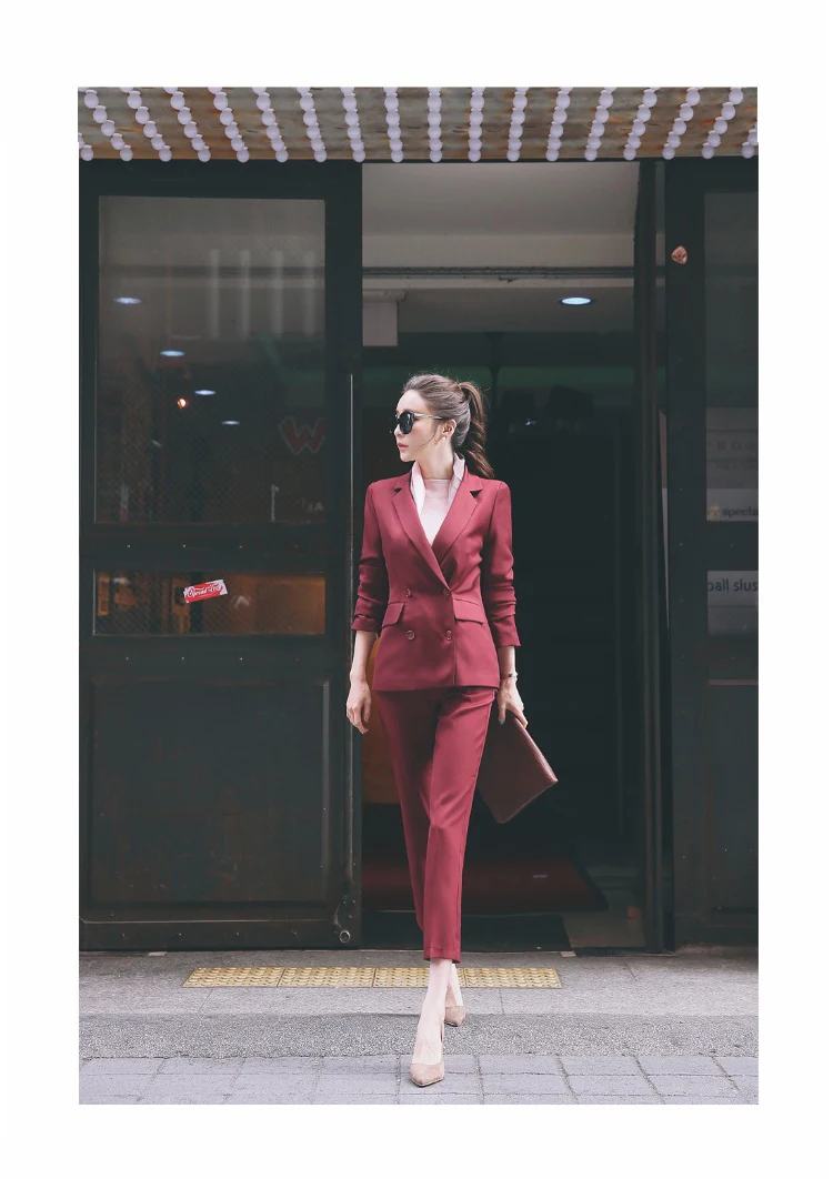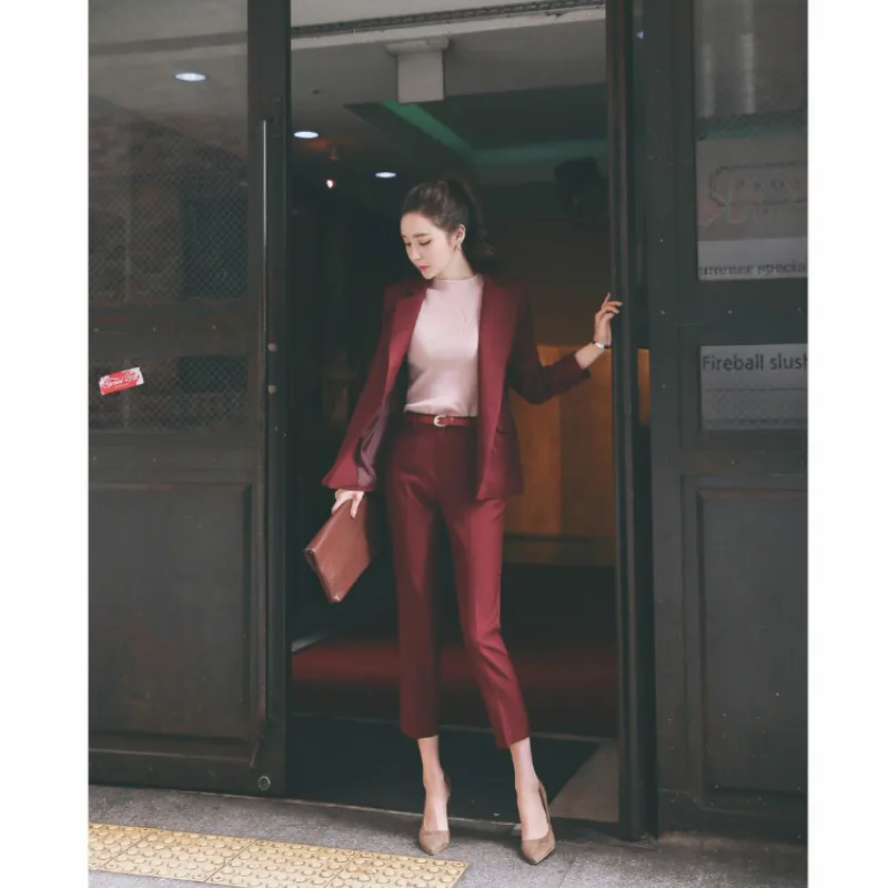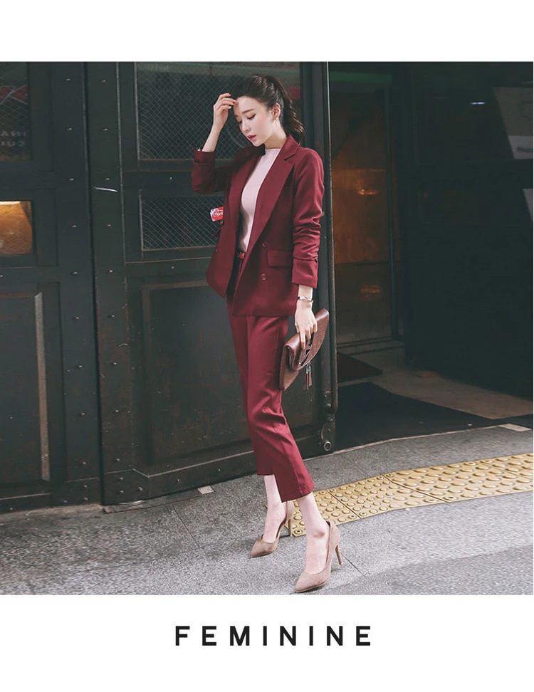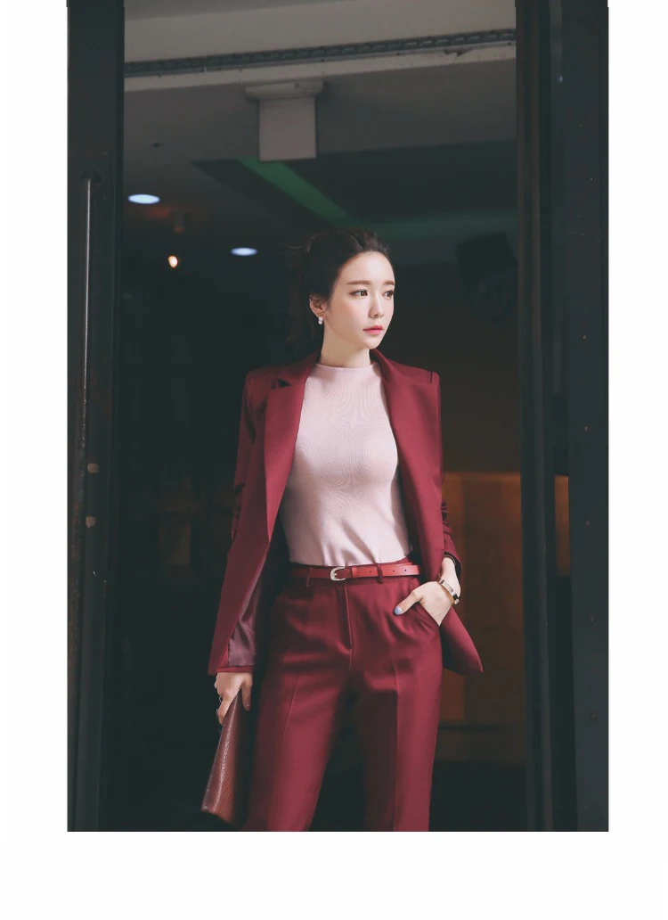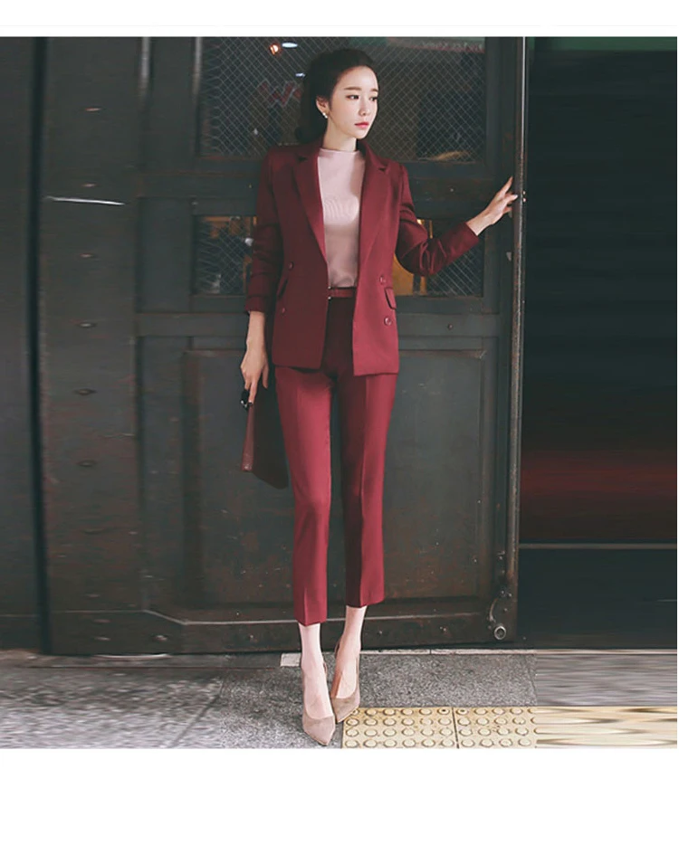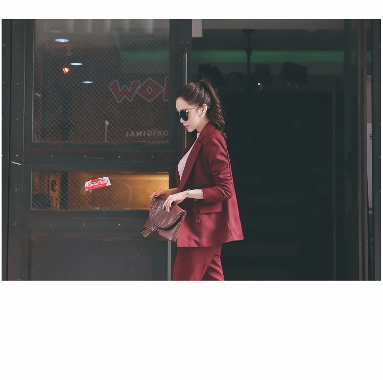 | Women's Two-piece Sets Korean Casual Elegant Slim Burgundy Solid Single Breasted Blazer + Pants Thickening 2020 Spring New OL |