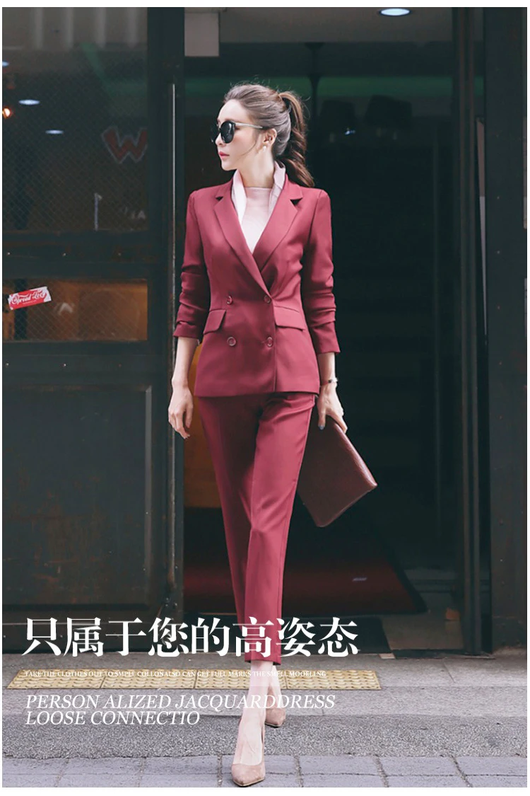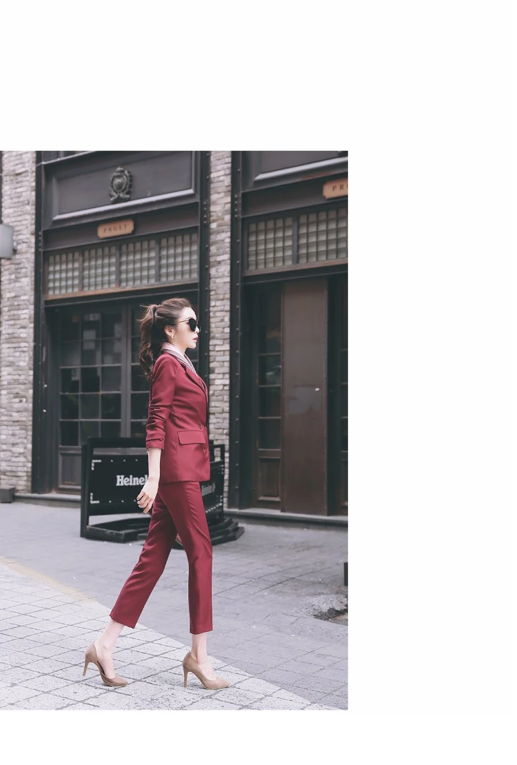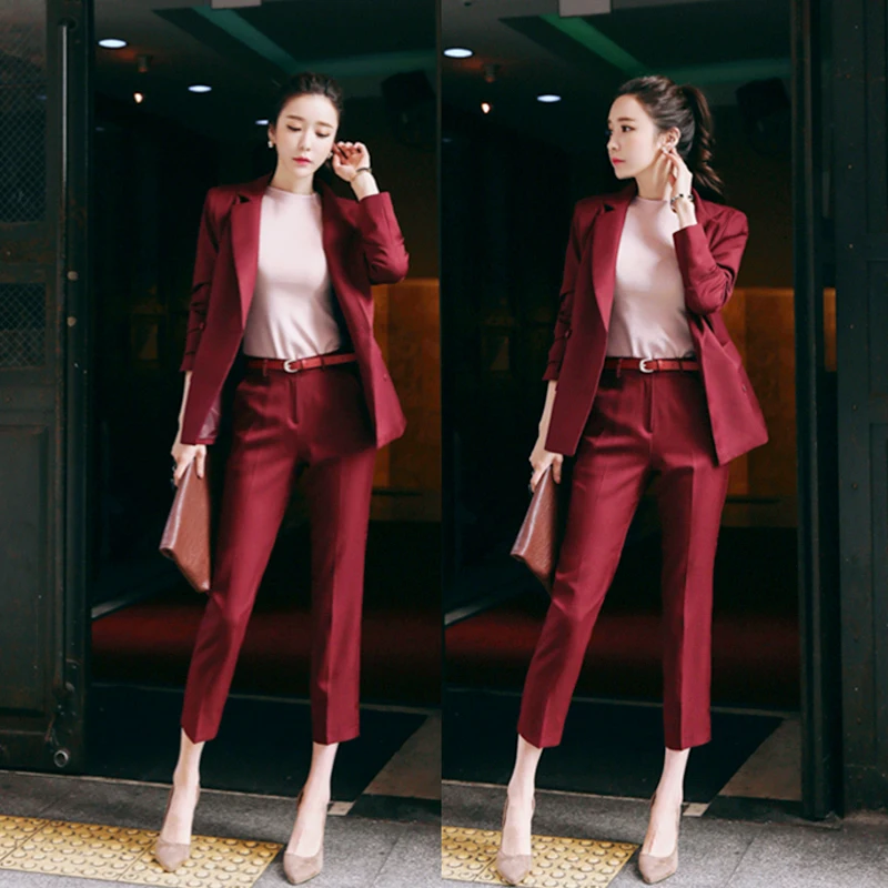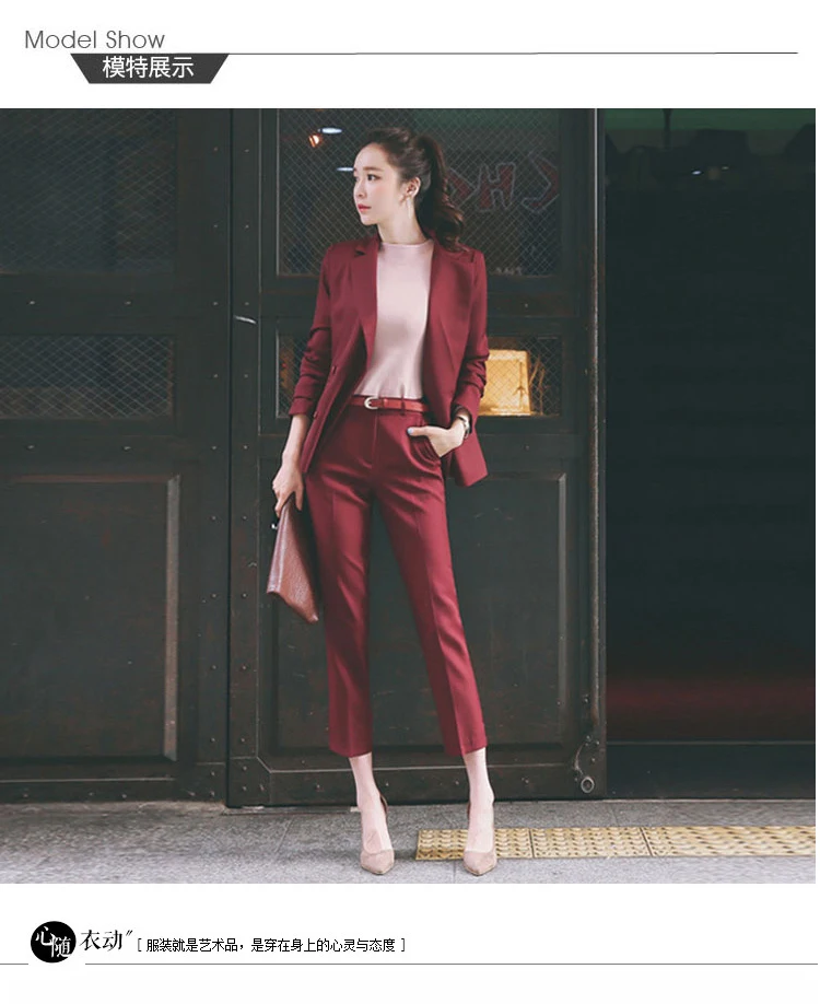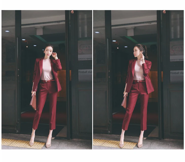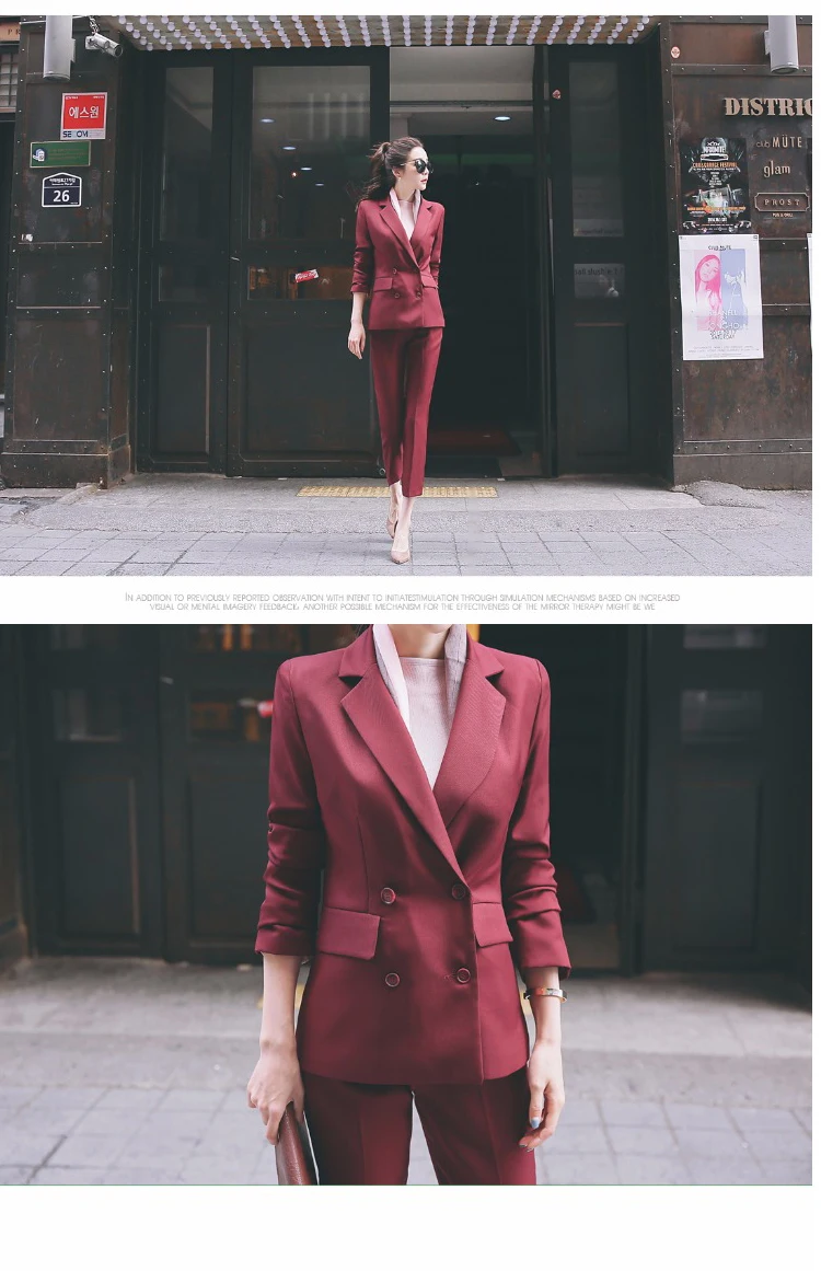 | Women's Two-piece Sets Korean Casual Elegant Slim Burgundy Solid Single Breasted Blazer + Pants Thickening 2020 Spring New OL |